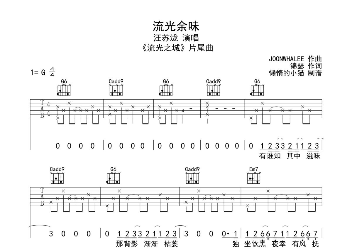 汪苏泷《流光余味》吉他谱 - G调弹唱六线谱