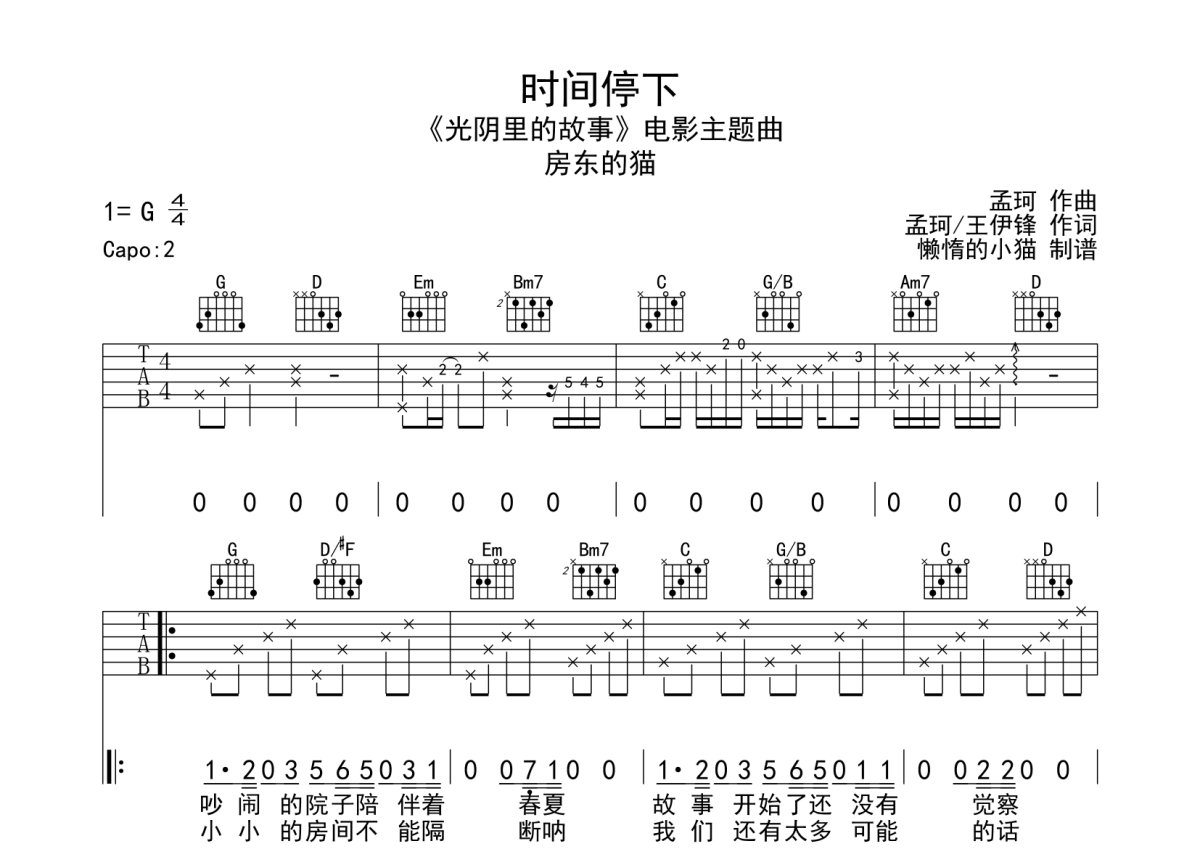 房东的猫《时间停下》吉他谱 - G调弹唱六线谱