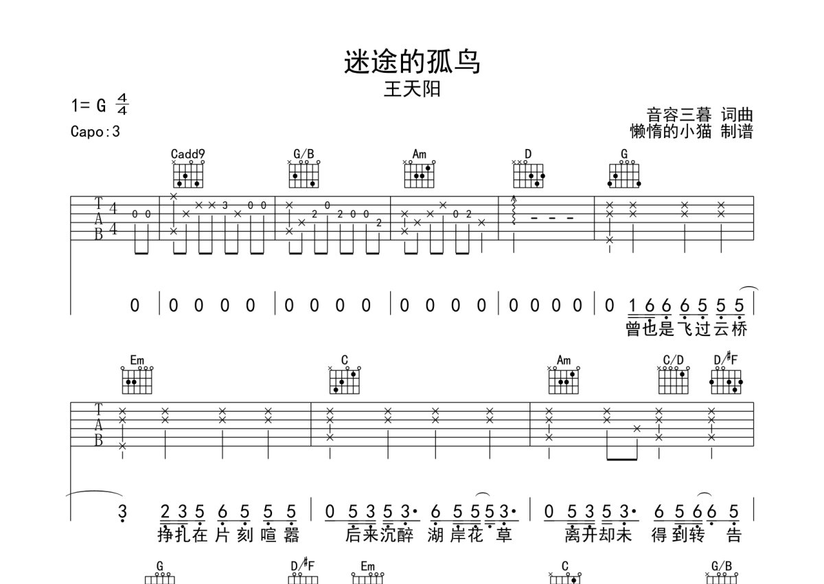王天阳《迷途的孤鸟》吉他谱 - G调弹唱六线谱