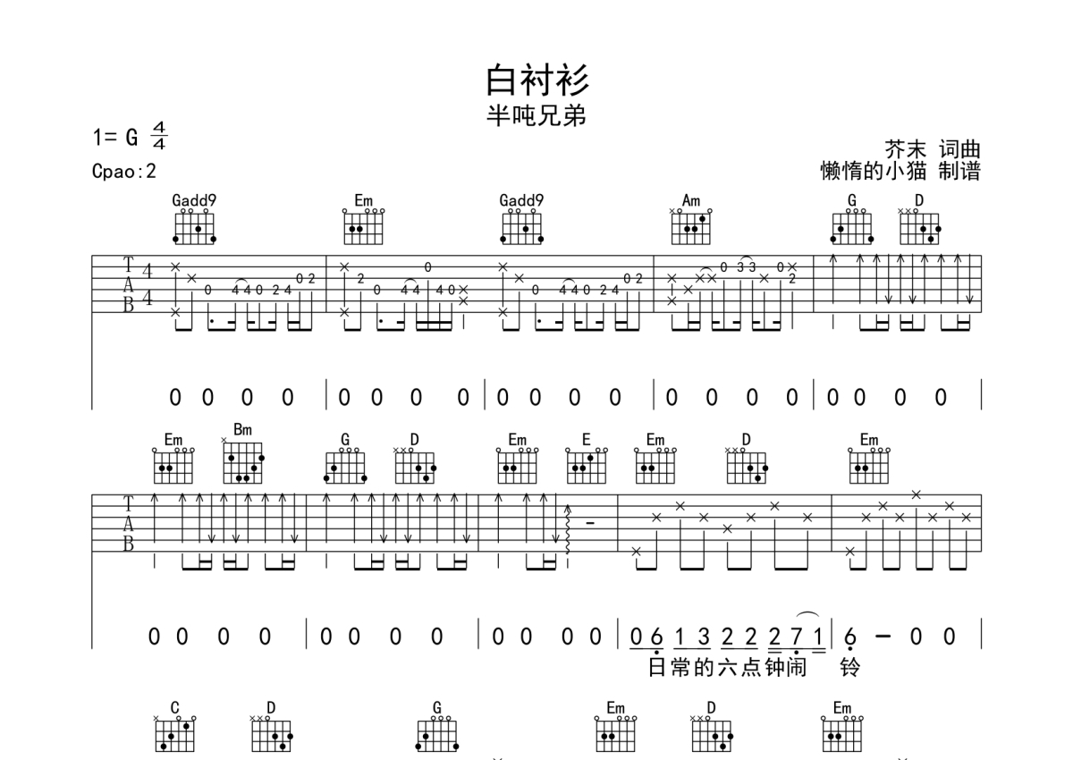 半吨兄弟《白衬衫》吉他谱 - G调弹唱六线谱