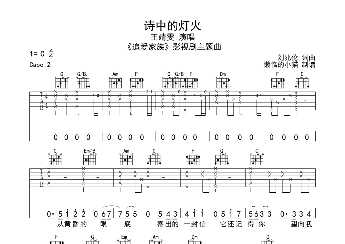 王靖雯《诗中的灯火》吉他谱 - C调弹唱六线谱
