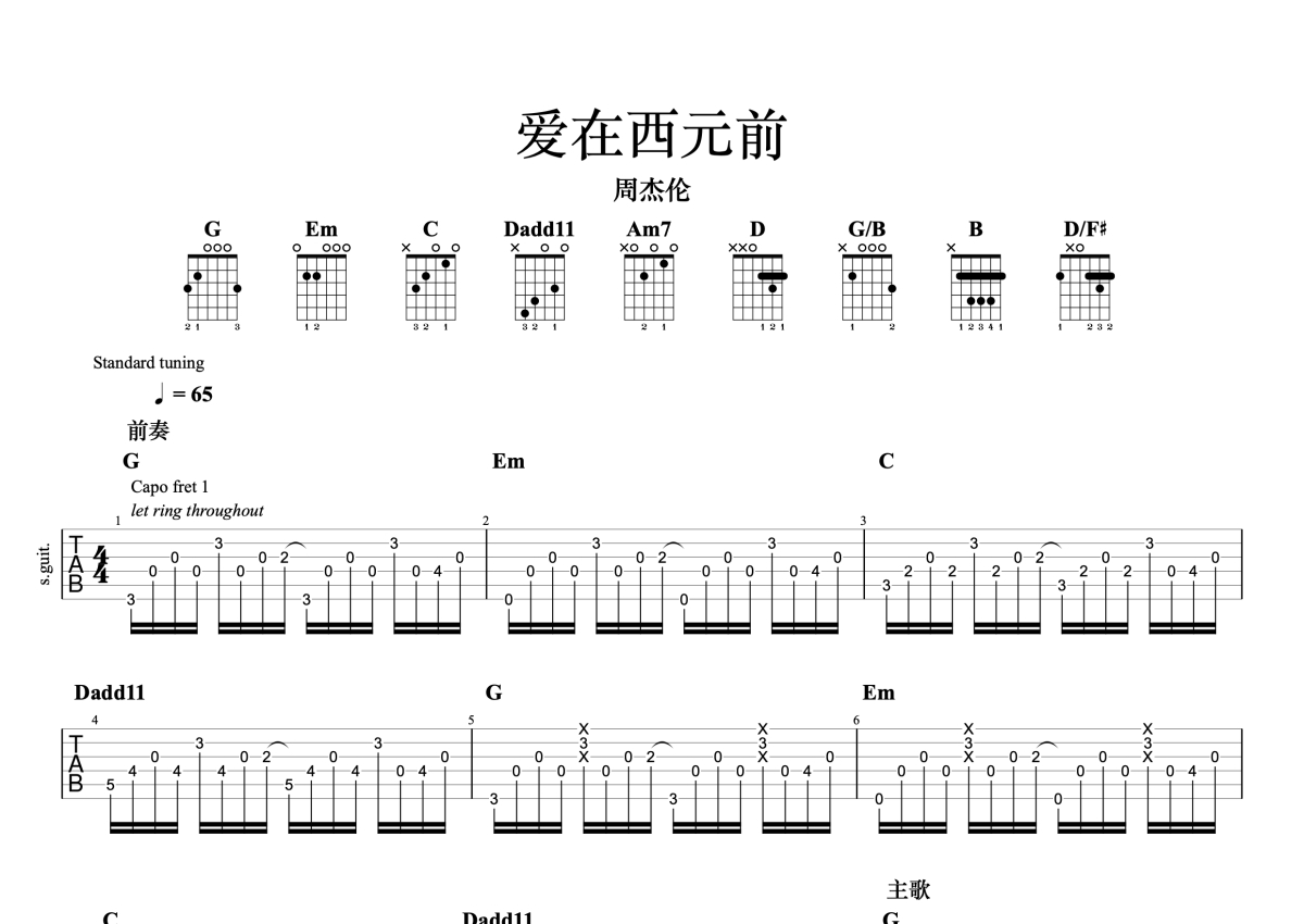 周杰伦《爱在西元前》吉他谱 - G调独奏六线谱 - 完整编配版
