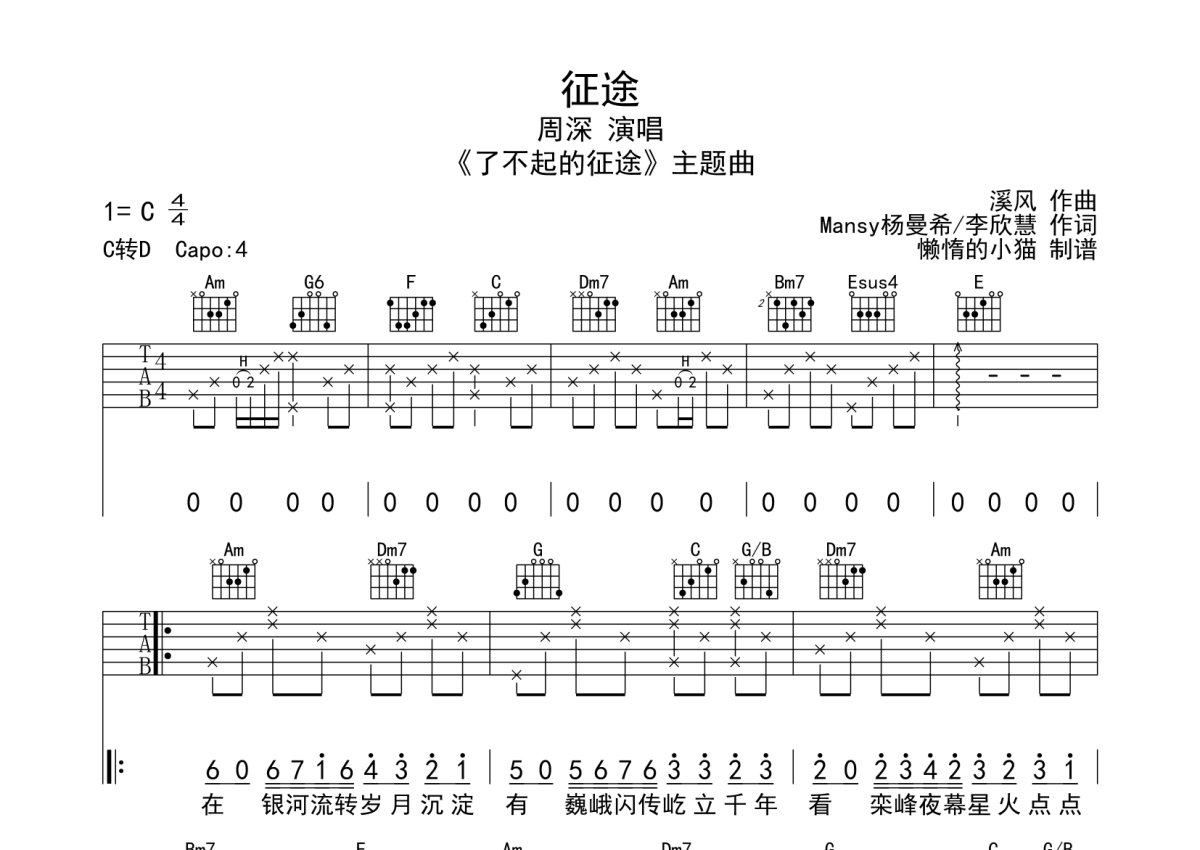 周深《征途》吉他谱 - C调弹唱六线谱