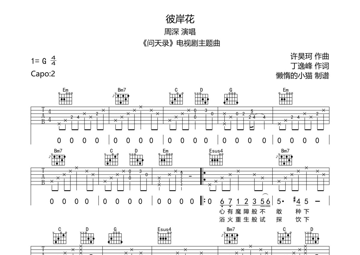 周深《彼岸花》吉他谱 - G调弹唱六线谱
