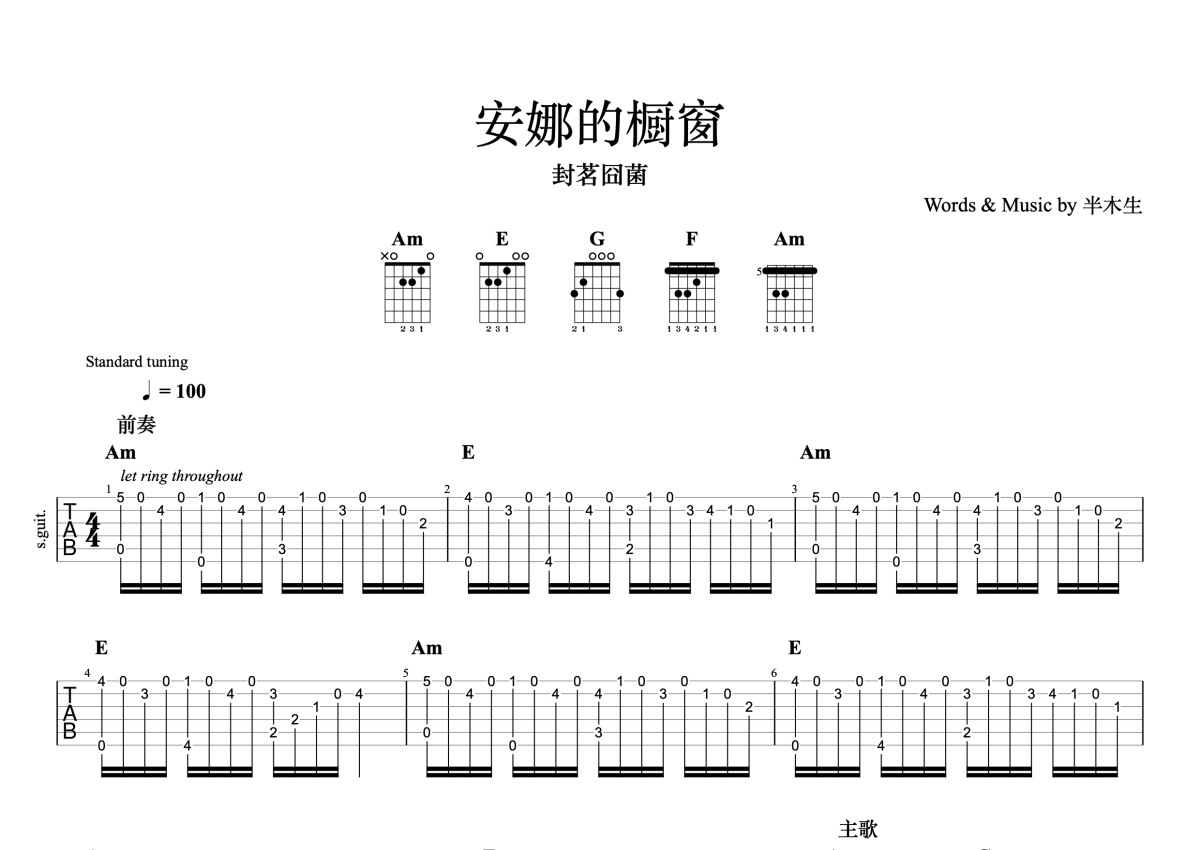 封茗囧菌《安娜的橱窗》吉他谱 - C调独奏六线谱 - 完整编配版