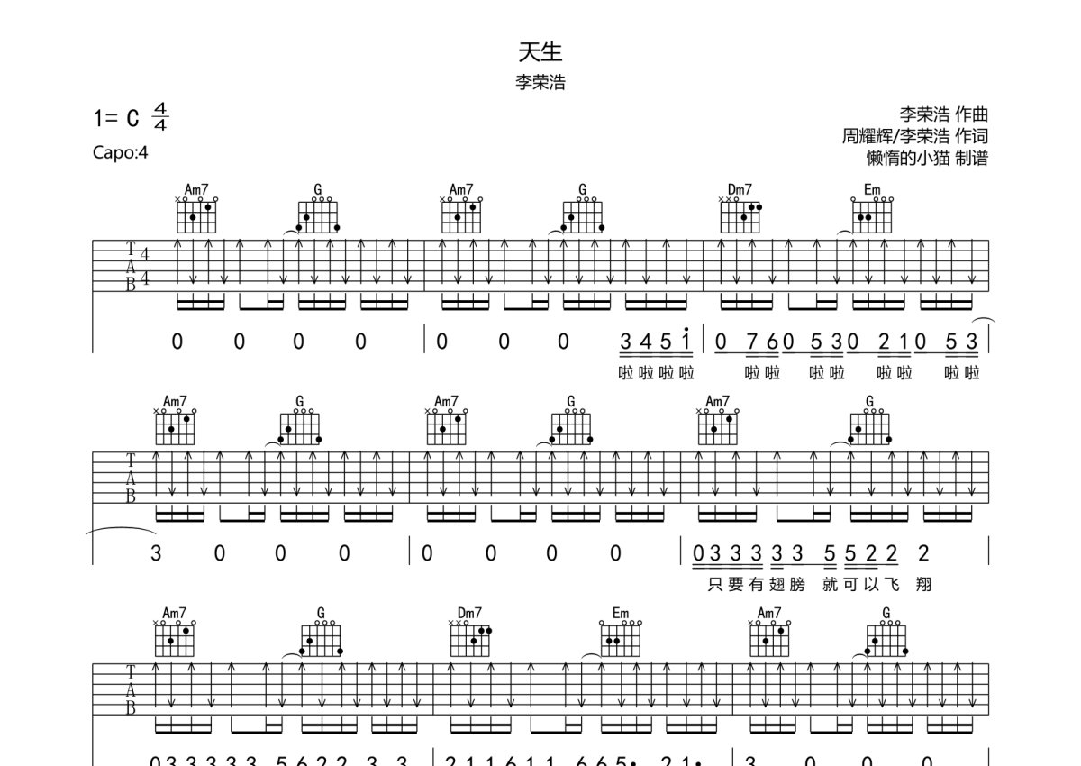 李荣浩《天生》吉他谱 - C调弹唱六线谱