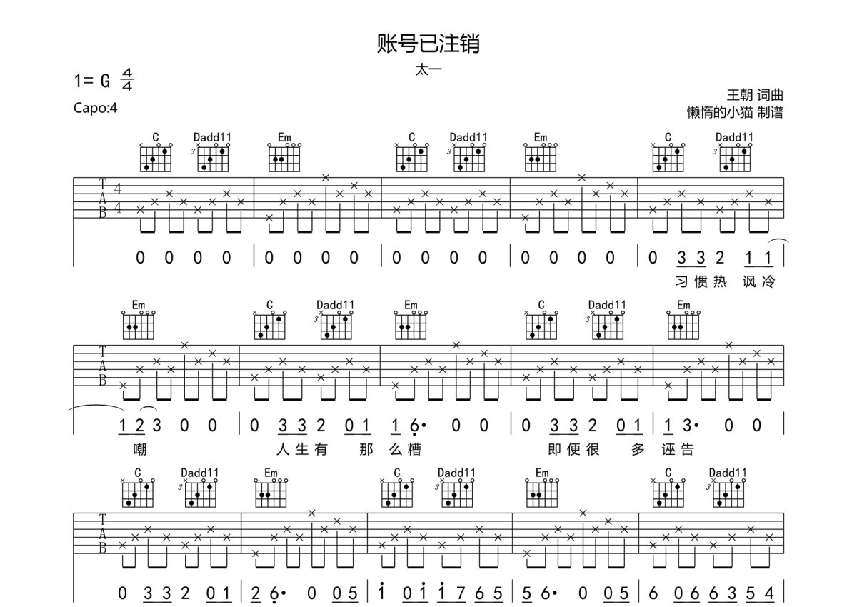 太一《账号已注销》吉他谱 - G调弹唱六线谱