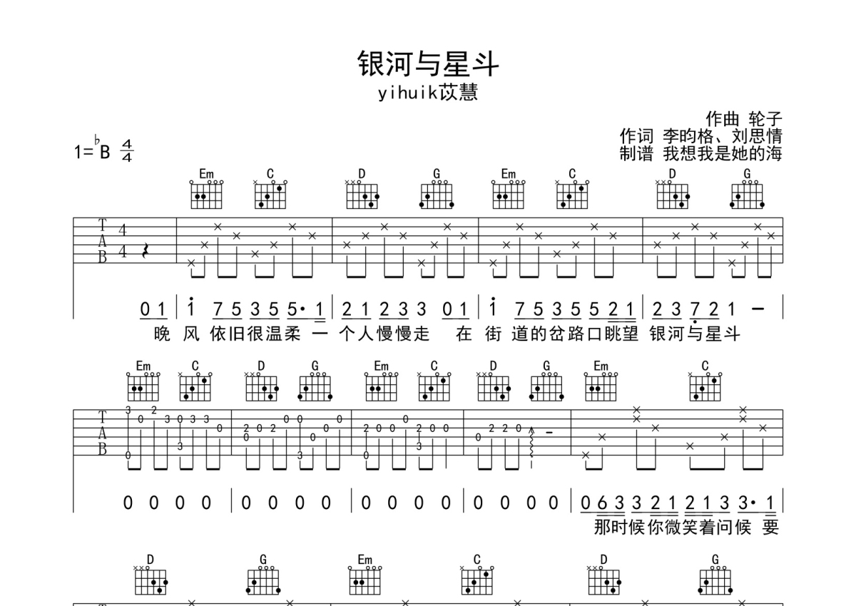 Yihuik苡慧《银河与星斗》吉他谱 - G调弹唱六线谱