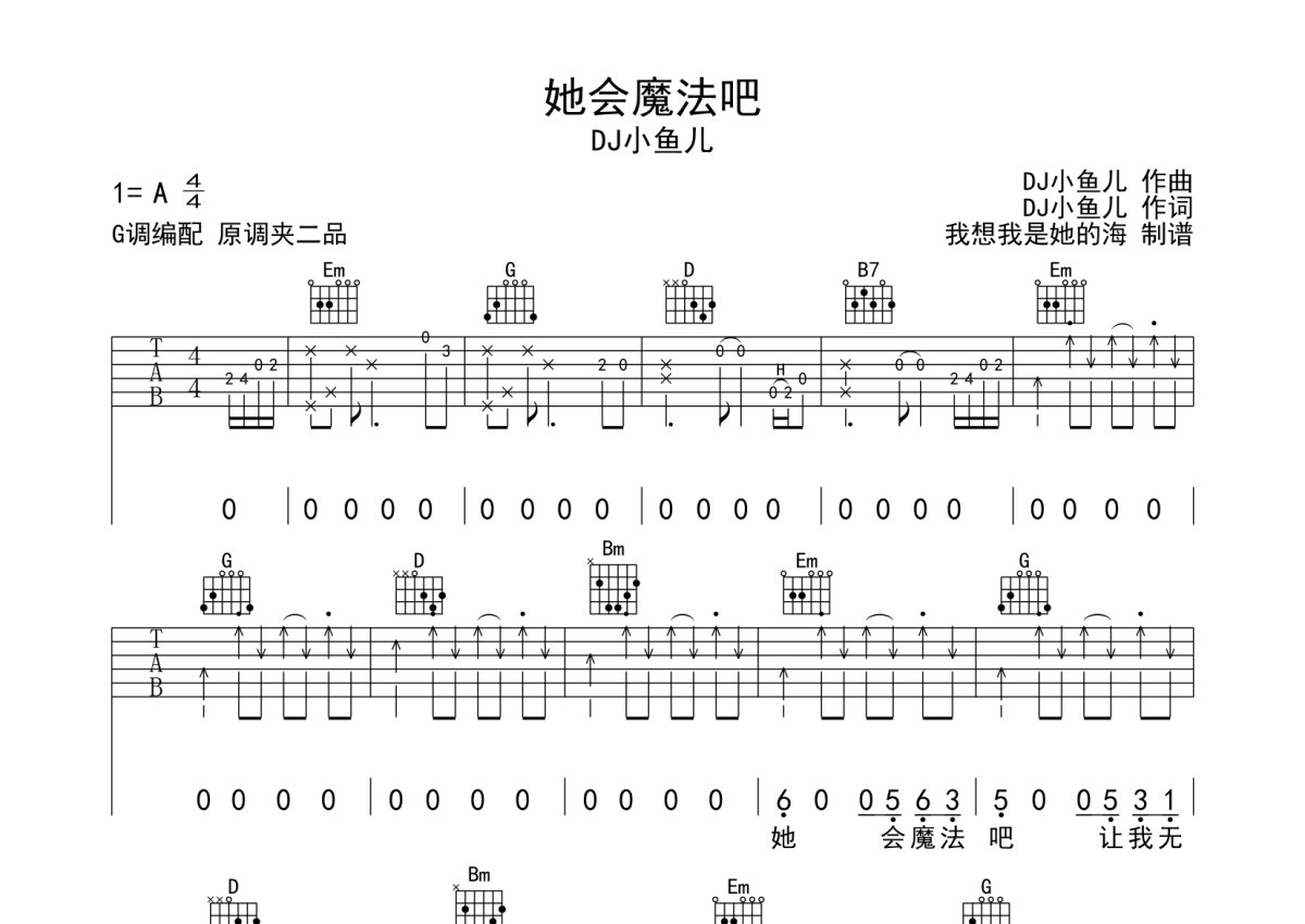 DJ小鱼儿《她会魔法吧》吉他谱 - G调弹唱六线谱 - 扫弦版
