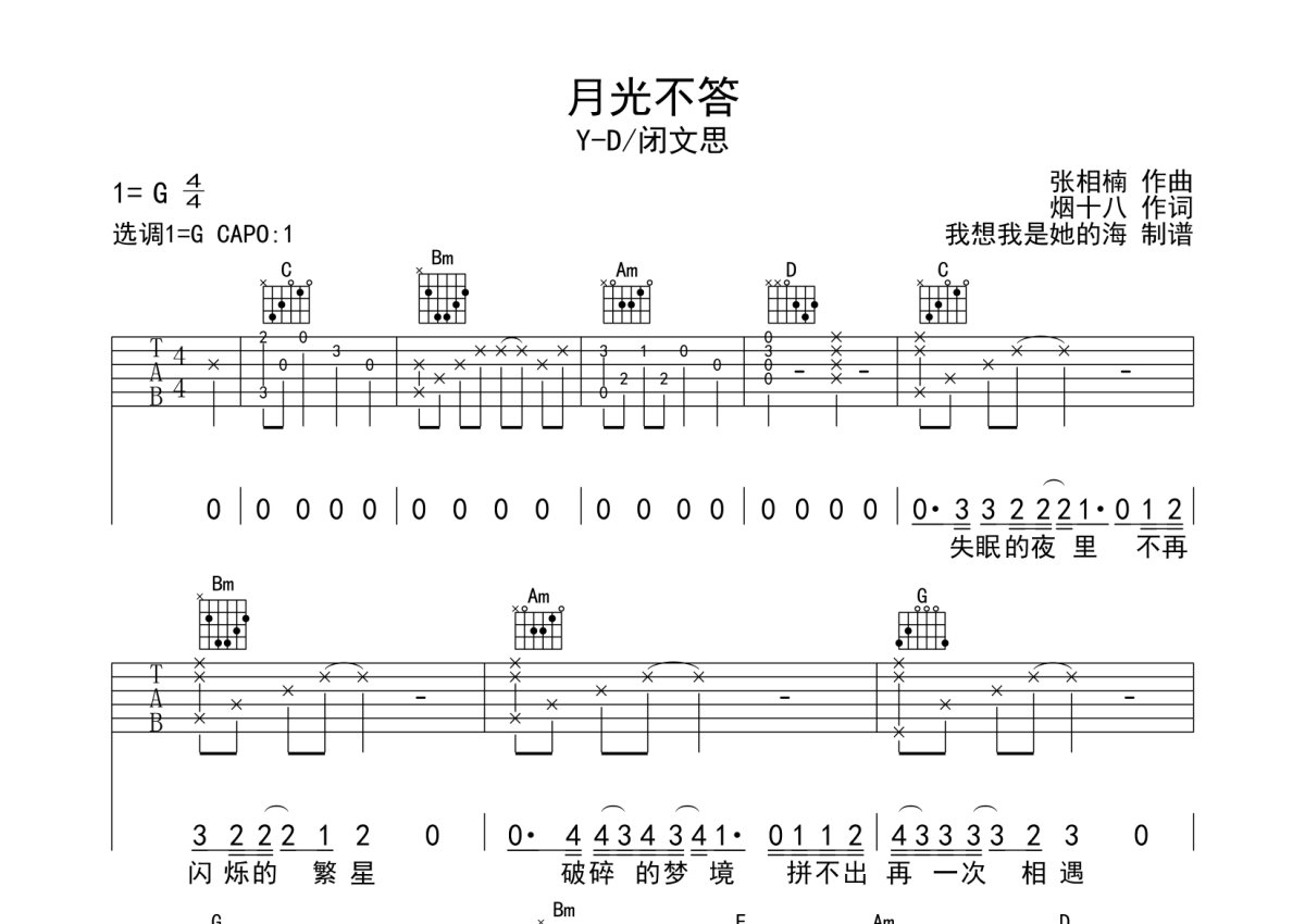Y-D/闭思文《月光不答》吉他谱 - G调弹唱六线谱