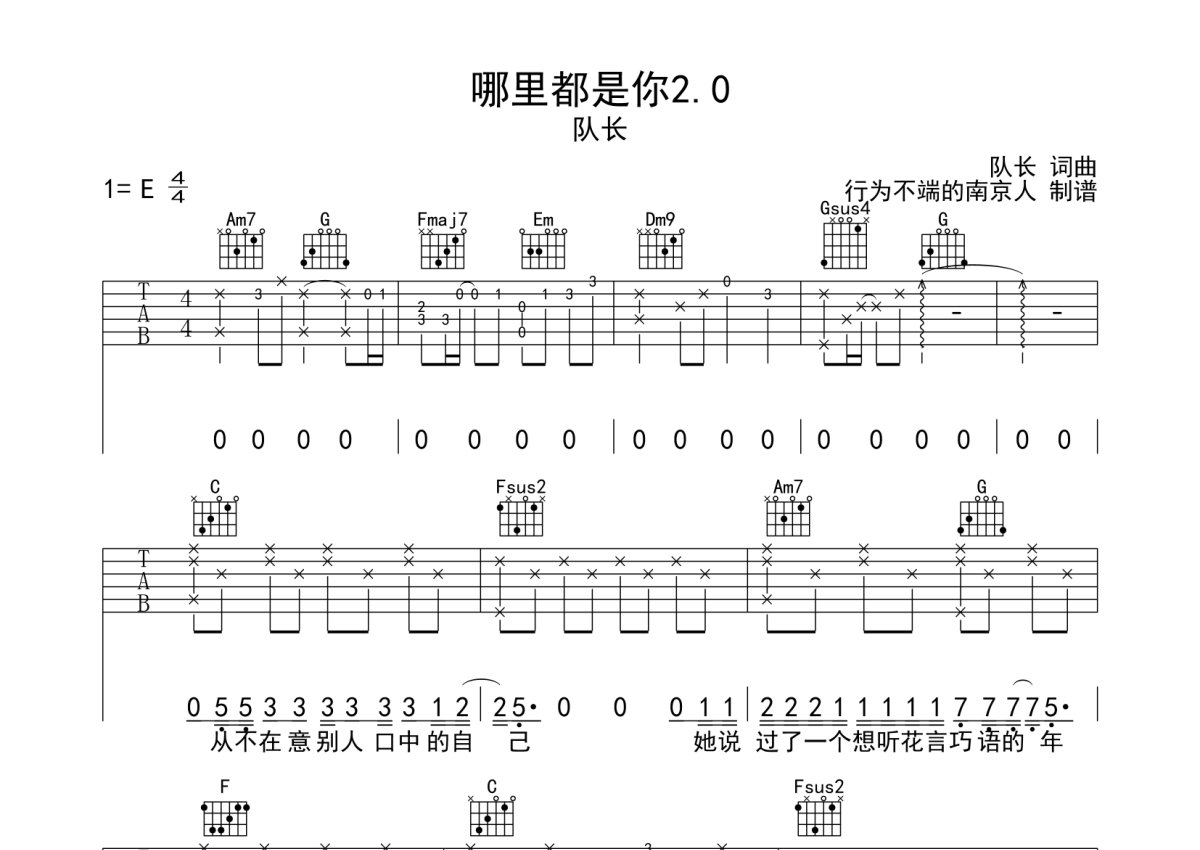 队长《哪里都是你2.0》吉他谱 - C调弹唱六线谱