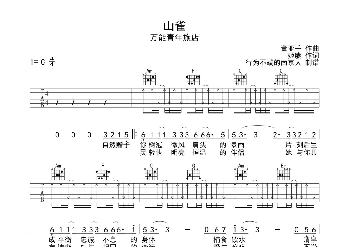 《山雀》是万能青年旅店演唱的一首歌曲,本吉他谱采用的是C调指法编配,这份吉他谱共有三张高清图谱,图谱由 @卜 编配上传,图谱使用六线谱编配,包含吉他和弦指法、简谱以及歌词部分,使用这份山雀吉他谱,可以让你更加方便地掌握这首歌曲的弹唱技巧,快来尝试吧。“平衡忠诚不息的身体”万青新专辑冀西南林路行中的山雀节奏感很强的一首歌。