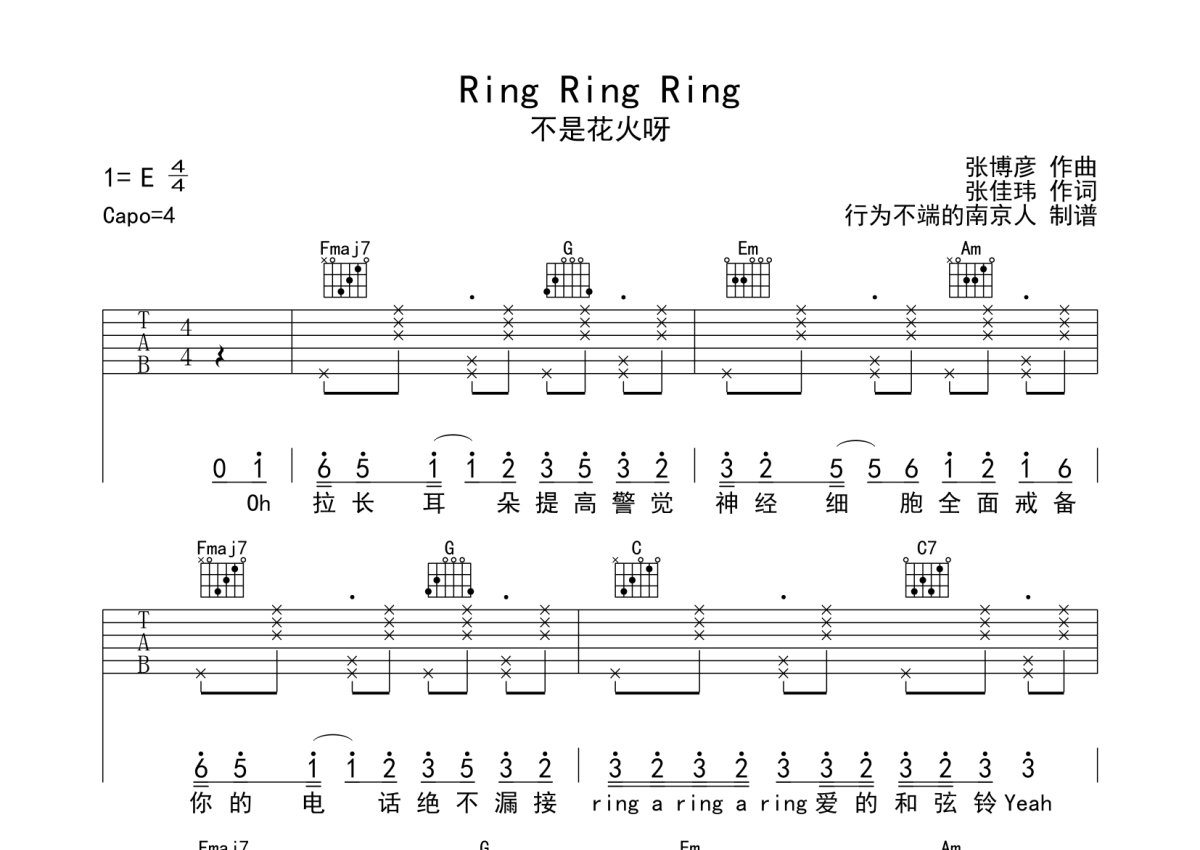 不是花火呀《Ring Ring Ring》吉他谱 - C调弹唱六线谱