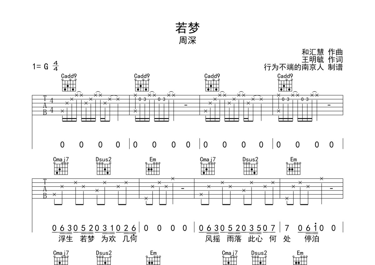 周深《若梦》吉他谱 - G调弹唱六线谱