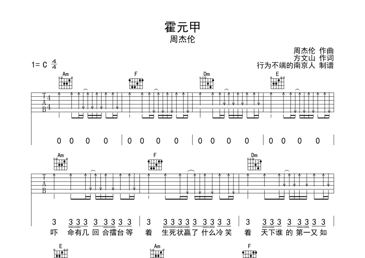周杰伦《霍元甲》吉他谱 - C调弹唱六线谱
