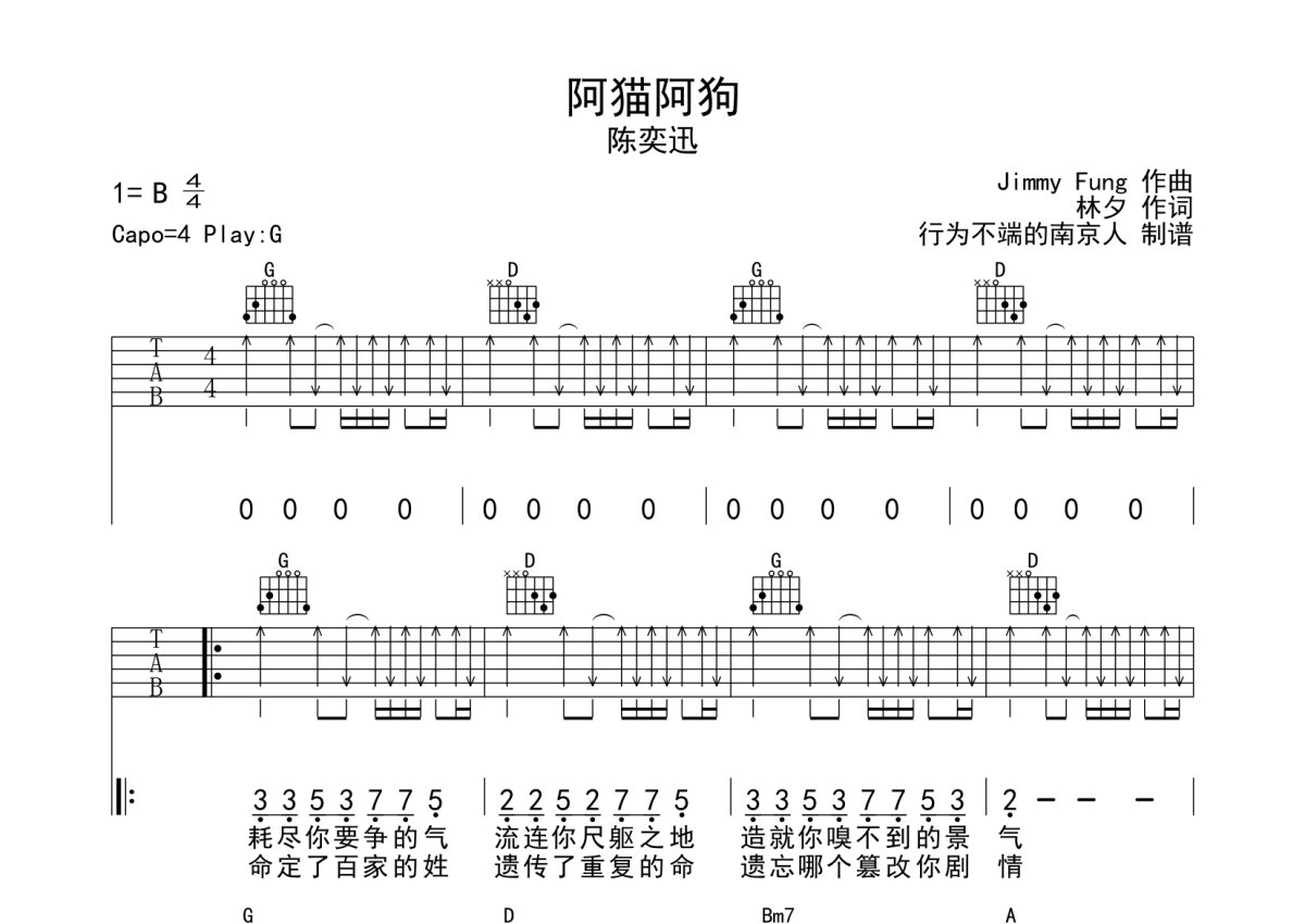 陈奕迅《阿猫阿狗》吉他谱 - G调弹唱六线谱