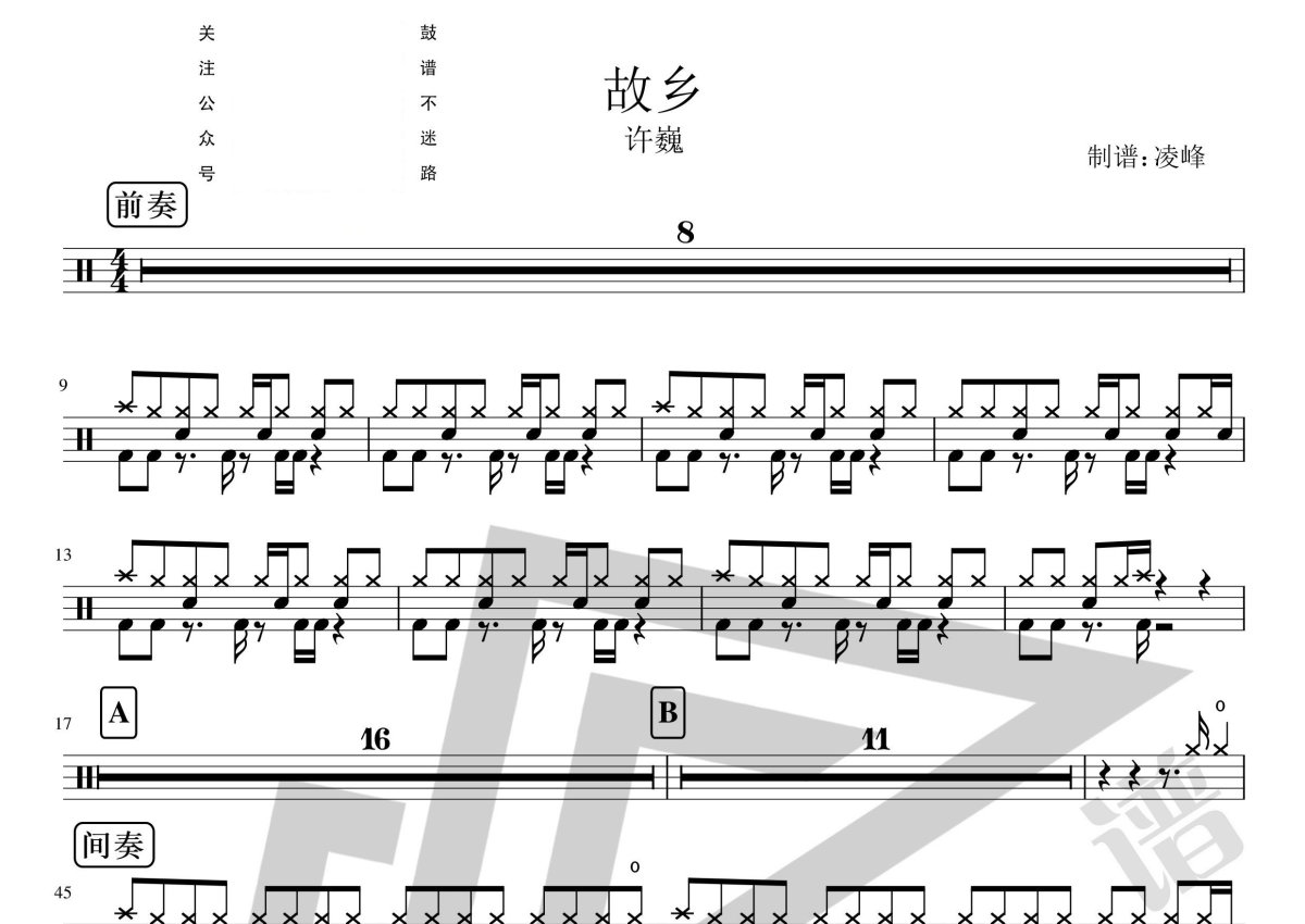 《故乡》是许巍演唱的一首歌曲,这份鼓谱共有两张高清图谱,图谱由 @A YLF 编配上传,图谱使用五线谱编配,使用这份故乡架子鼓谱,你将能够轻松地敲打出这首许巍的故乡,快来尝试吧。许巍《故乡》架子鼓谱,凌峰制谱编配出品,共有2张高清图谱,免翻页排版设计。