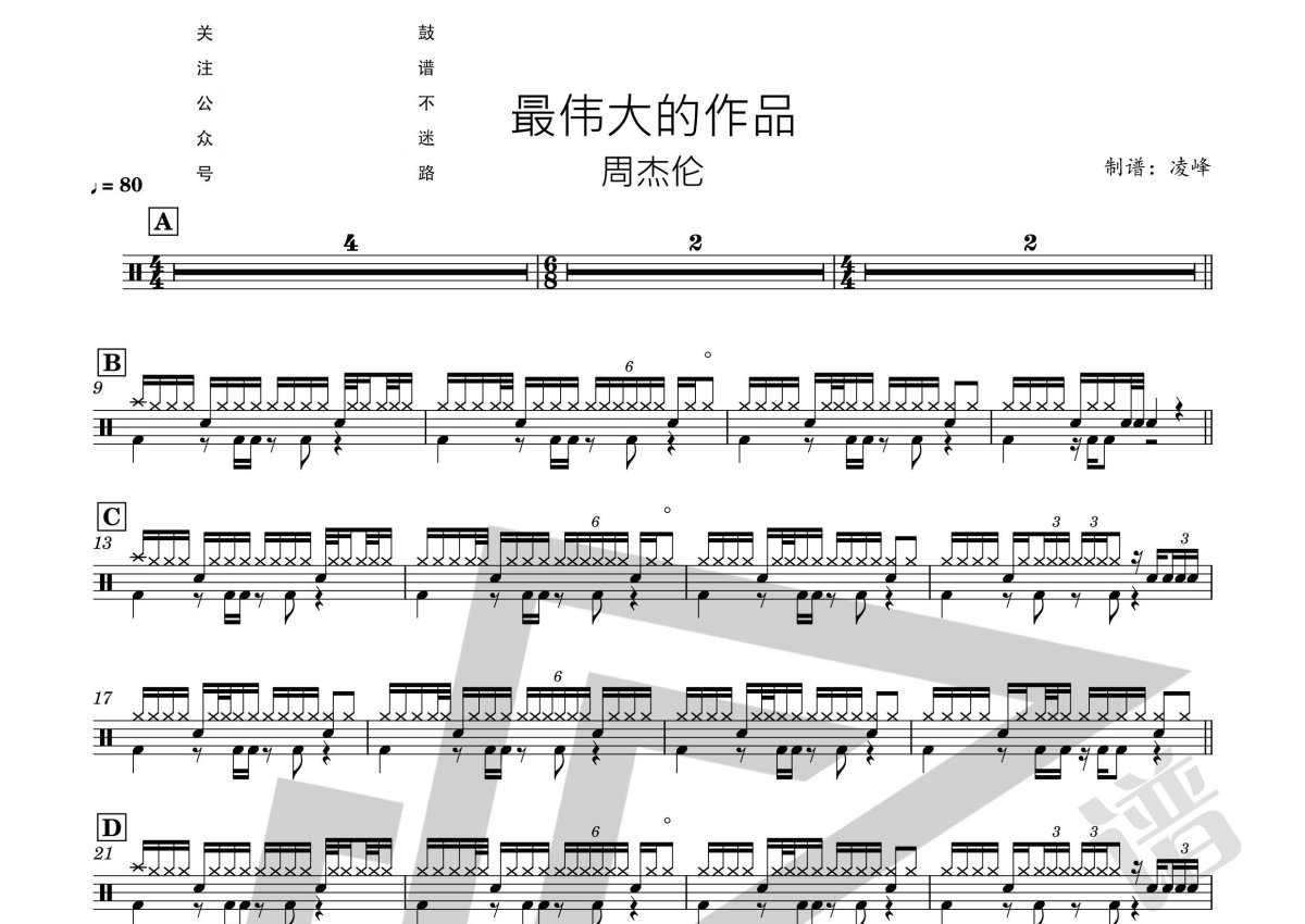 《最伟大的作品》是周杰伦演唱的一首歌曲,这份鼓谱共有两张高清图谱,图谱由 @A YLF 编配上传,图谱使用五线谱编配,使用这份最伟大的作品架子鼓谱,你将能够轻松地敲打出这首周杰伦的最伟大的作品,快来尝试吧。周杰伦《最伟大的作品》架子鼓谱,凌峰制谱编配出品,共有2张高清图谱,免翻页排版设计。
