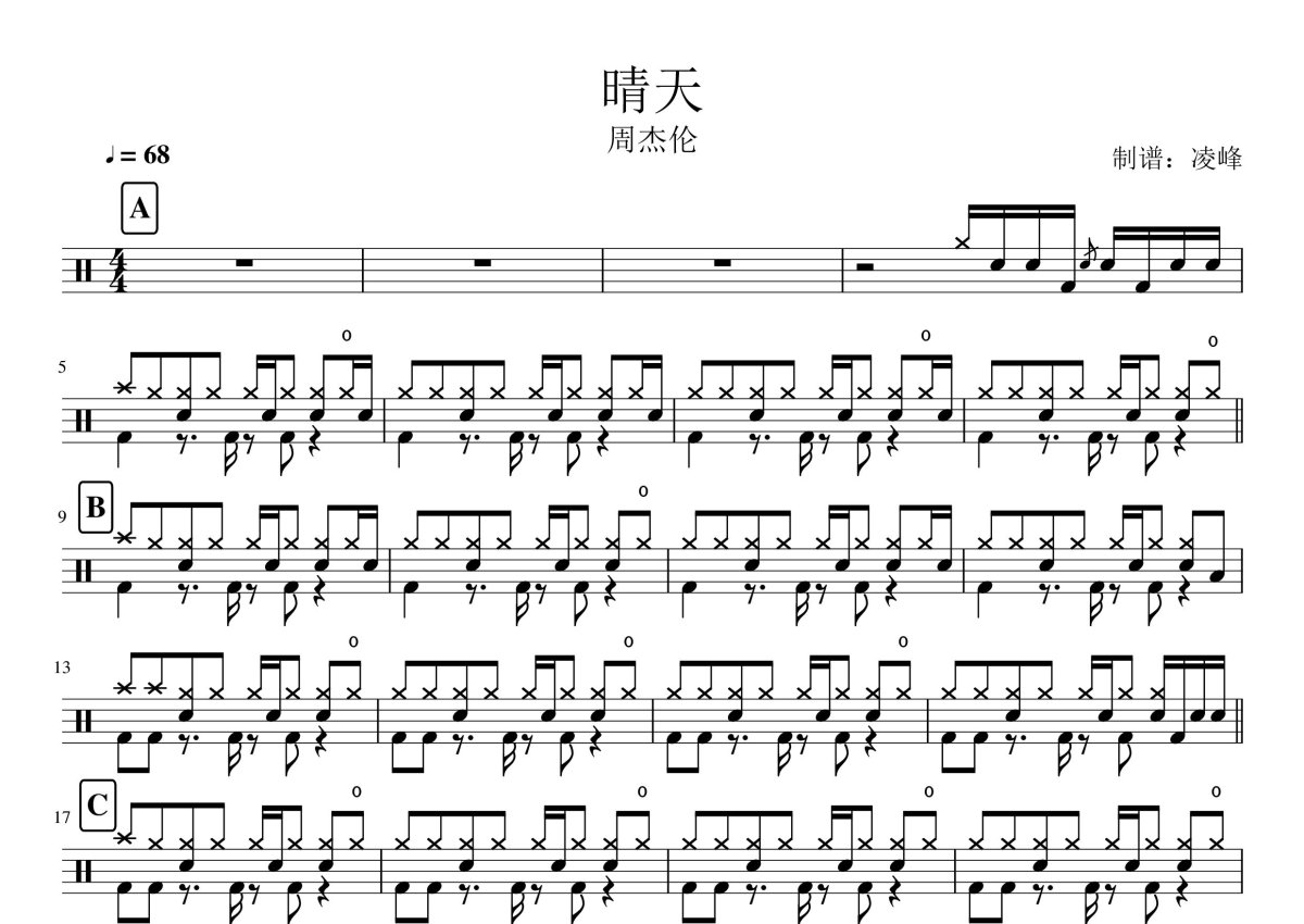 《晴天》是周杰伦演唱的一首歌曲,这份鼓谱共有两张高清图谱,图谱由 @A YLF 编配上传,图谱使用五线谱编配,使用这份晴天架子鼓谱,你将能够轻松地敲打出这首周杰伦的晴天,快来尝试吧。周杰伦《晴天》架子鼓谱,凌峰制谱编配出品,共有2张高清图谱,免翻页排版设计。