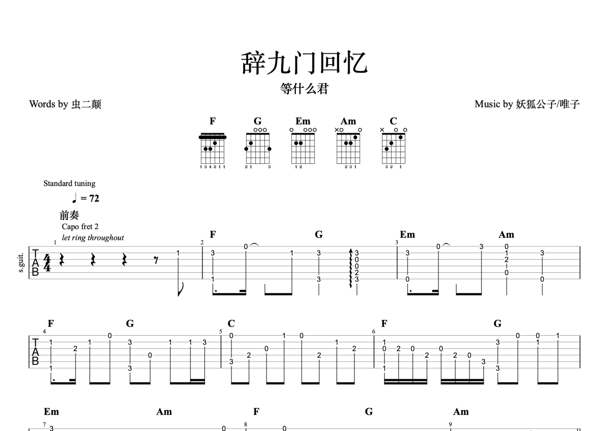 等什么君《辞九门回忆》吉他谱 - C调独奏六线谱 - 完整编配版