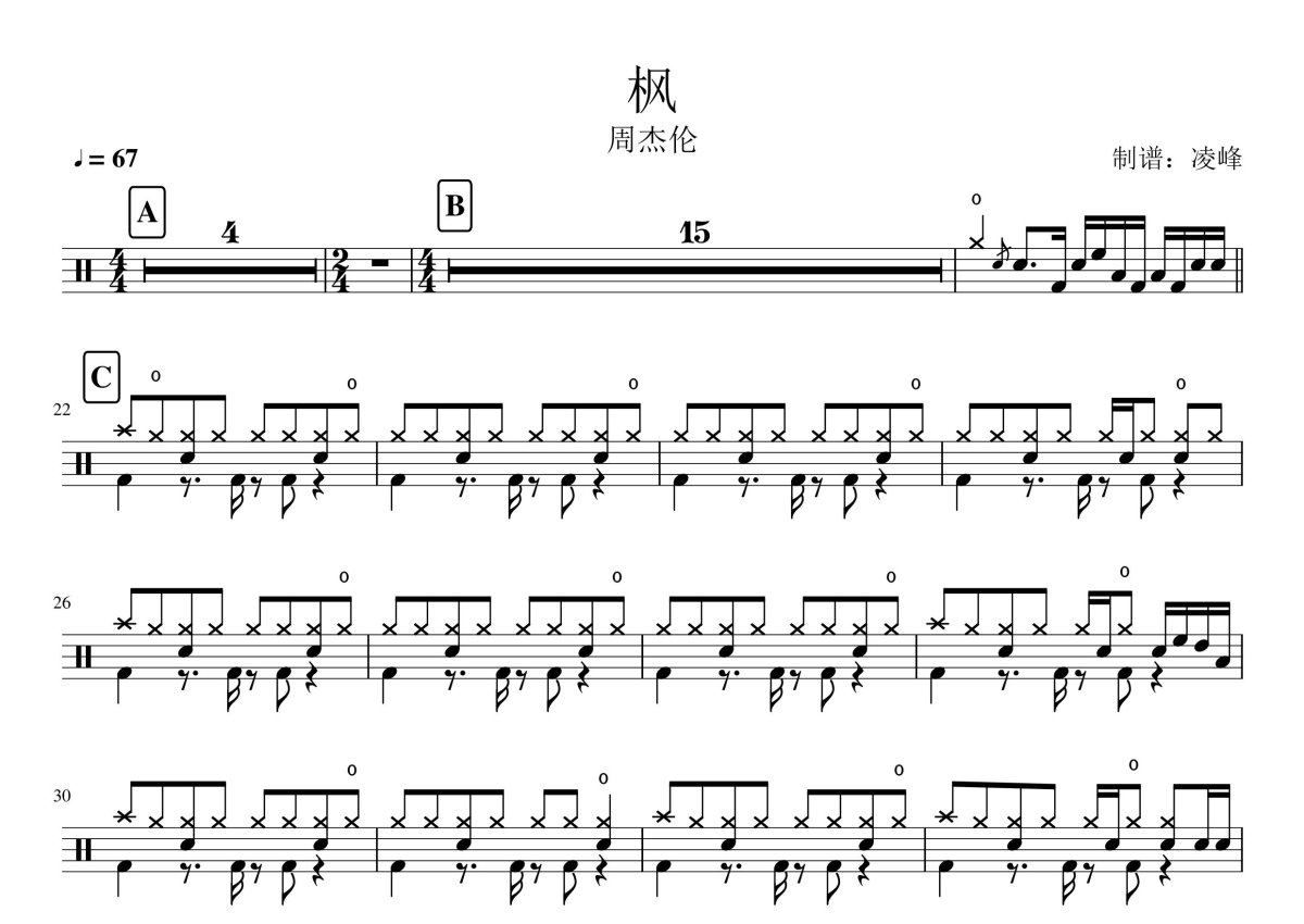 《枫》是周杰伦演唱的一首歌曲,这份鼓谱共有两张高清图谱,图谱由 @A YLF 编配上传,图谱使用五线谱编配,使用这份枫架子鼓谱,你将能够轻松地敲打出这首周杰伦的枫,快来尝试吧。周杰伦《枫》架子鼓谱,凌峰制谱编配出品,共有2张高清图谱,免翻页排版设计。