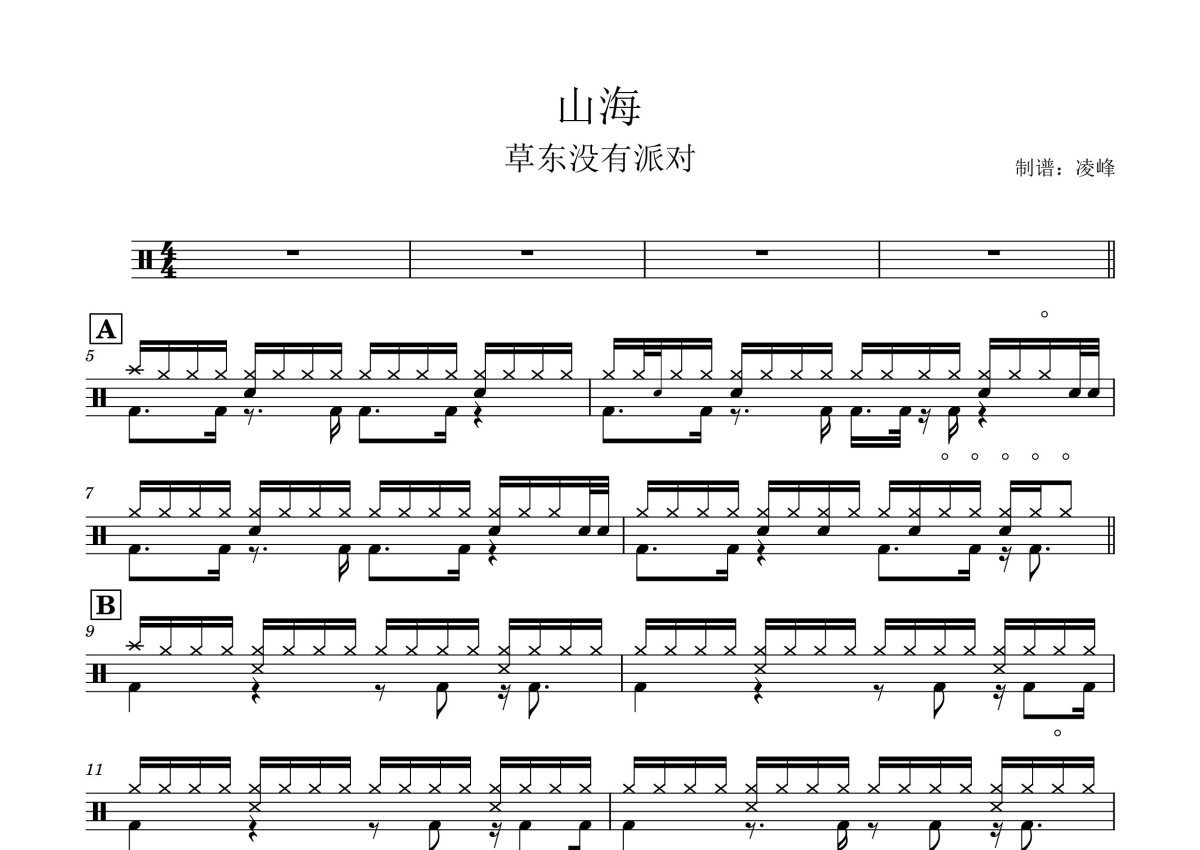 《山海》是草东没有派对演唱的一首歌曲,这份鼓谱共有三张高清图谱,图谱由 @A YLF 编配上传,图谱使用五线谱编配,使用这份山海架子鼓谱,你将能够轻松地敲打出这首草东没有派对的山海,快来尝试吧。草东没有派对《山海》架子鼓谱,凌峰制谱编配出品,共有3张高清图谱。