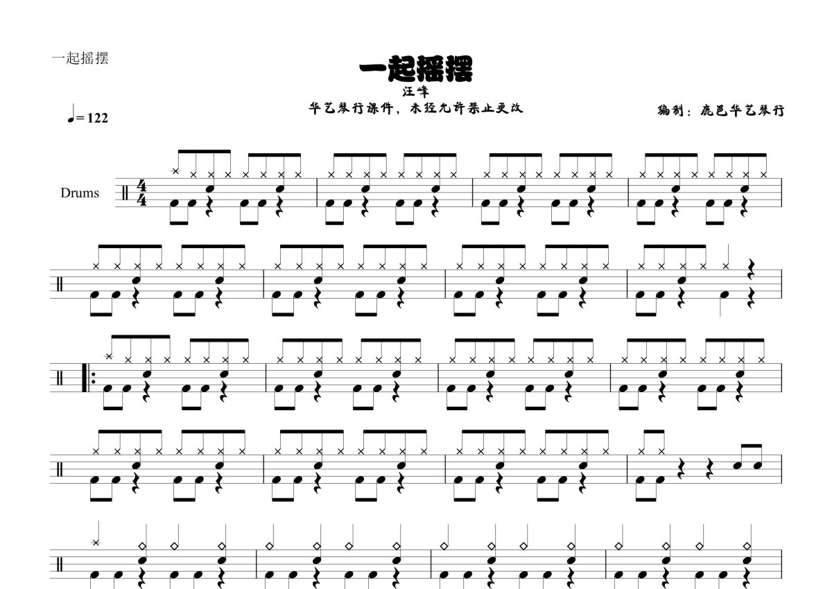 《一起摇摆》是汪峰演唱的一首歌曲,这份鼓谱共有两张高清图谱,图谱由 @鹿邑 华艺琴行 编配上传,图谱使用五线谱编配,使用这份一起摇摆架子鼓谱,你将能够轻松地敲打出这首汪峰的一起摇摆,快来尝试吧。汪峰《一起摇摆》架子鼓谱,鹿邑华艺琴行编配出品,共有2张高清图谱,免翻页排版设计。