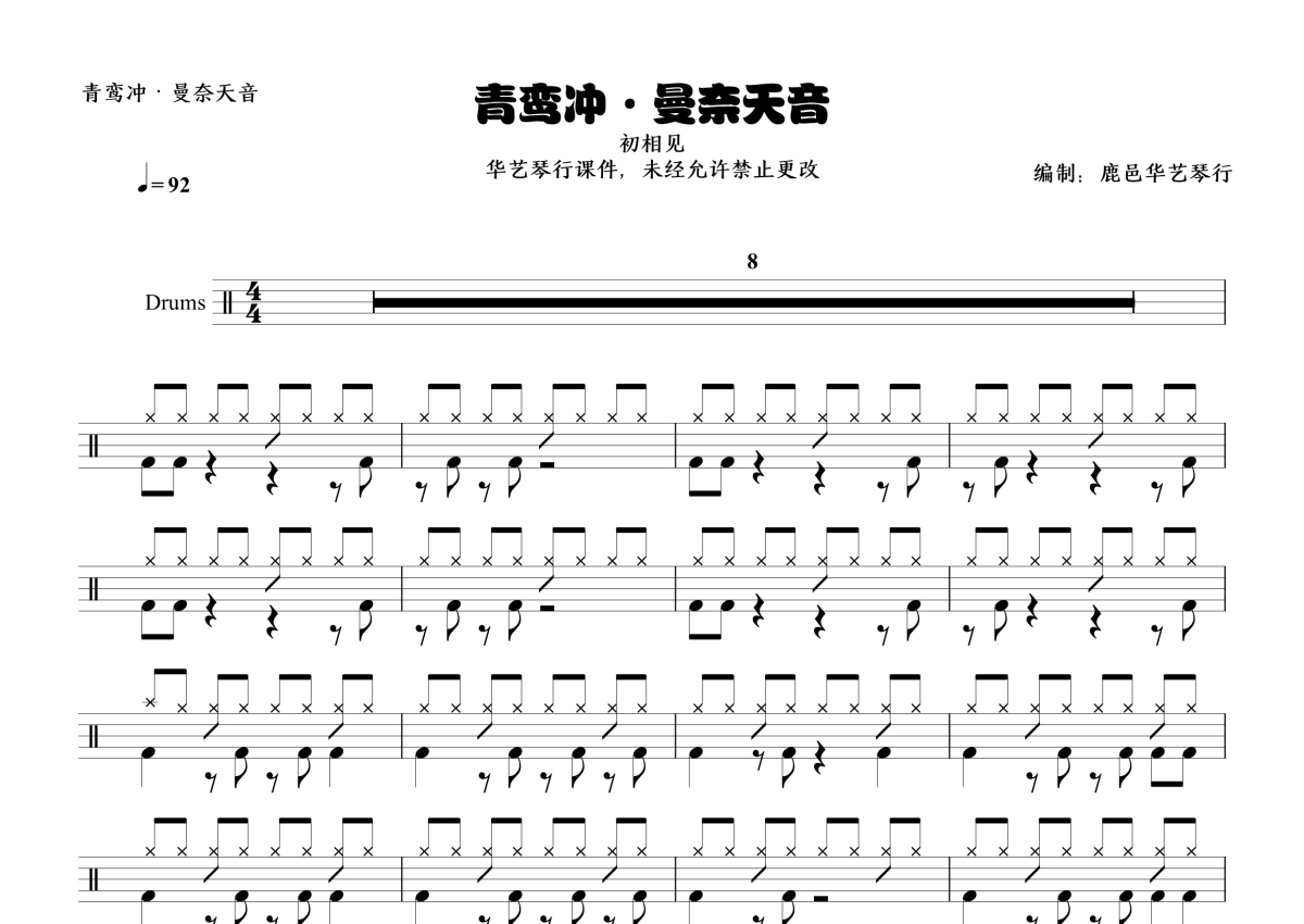 《青鸾冲·曼奈天音》是初相见演唱的一首歌曲,这份鼓谱共有两张高清图谱,图谱由 @鹿邑 华艺琴行 编配上传,图谱使用五线谱编配,使用这份青鸾冲·曼奈天音架子鼓谱,你将能够轻松地敲打出这首初相见的青鸾冲·曼奈天音,快来尝试吧。初相见《青鸾冲·曼奈天音》架子鼓谱,鹿邑华艺琴行编配出品,共有2张高清图谱,免翻页排版设计。
