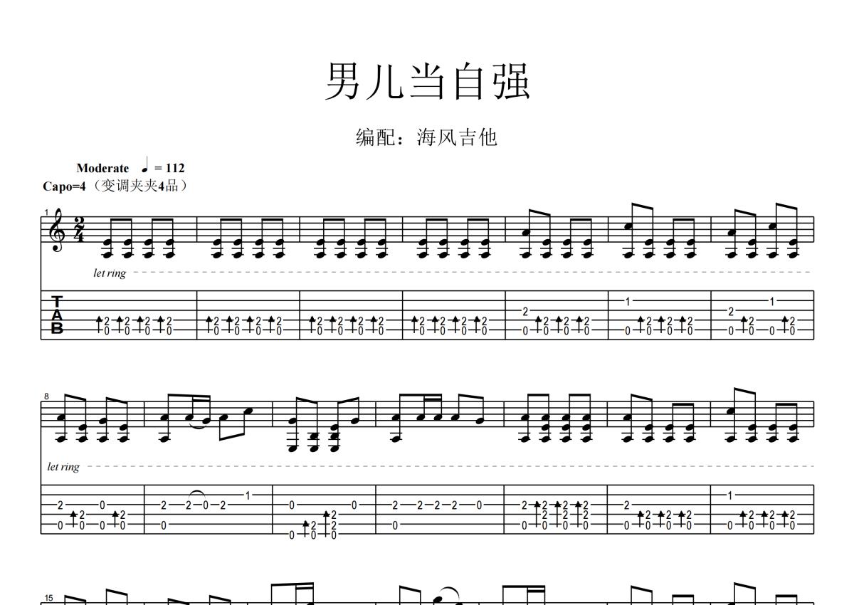 《男儿当自强》是电影《黄飞鸿》插曲演唱的一首歌曲,本吉他谱采用的是C调指法编配,这份吉他谱共有五张高清图谱,图谱由 @海风 编配上传,图谱使用六线谱编配,曲谱配备了相关的音频提供试听,使用这份男儿当自强吉他谱,可以让你更加方便地掌握这首歌曲的演奏技巧,快来尝试吧。电影《黄飞鸿》插曲《男儿当自强》吉他谱_C调吉他独奏谱。