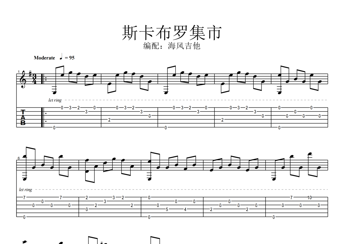 《斯卡布罗集市》是英国民歌演唱的一首歌曲,本吉他谱采用的是G调指法编配,这份吉他谱共有两张高清图谱,图谱由 @海风 编配上传,图谱使用六线谱编配,曲谱配备了相关的音频提供试听,使用这份斯卡布罗集市吉他谱,可以让你更加方便地掌握这首歌曲的演奏技巧,快来尝试吧。英国民歌《斯卡布罗集市》吉他谱_G调吉他独奏谱。