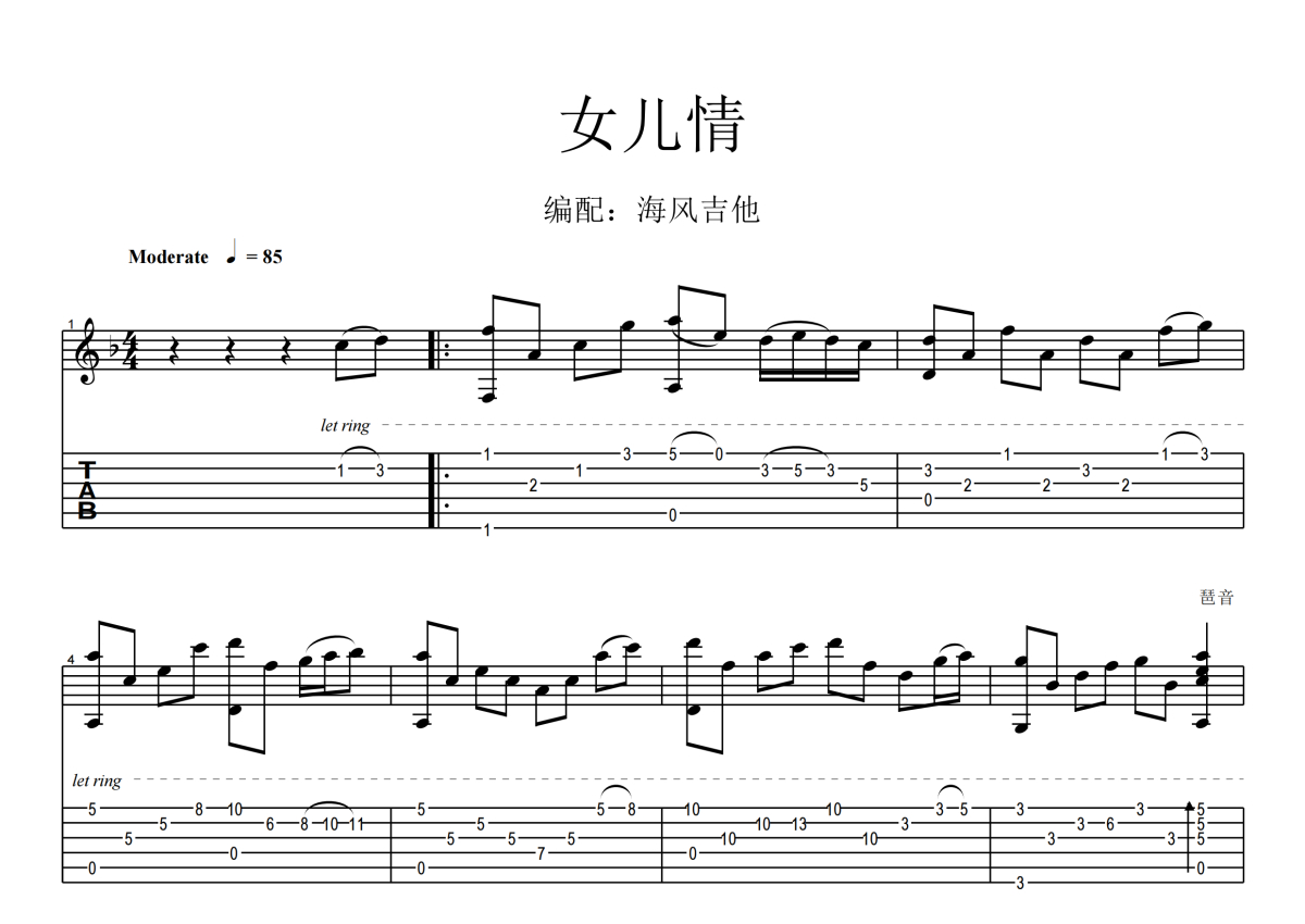 《女儿情》是电视剧《西游记》插曲演唱的一首歌曲,本吉他谱采用的是F调指法编配,这份吉他谱共有两张高清图谱,图谱由 @海风 编配上传,图谱使用六线谱编配,曲谱配备了相关的音频提供试听,使用这份女儿情吉他谱,可以让你更加方便地掌握这首歌曲的演奏技巧,快来尝试吧。电视剧《西游记》插曲《女儿情》吉他谱_F调吉他独奏谱。