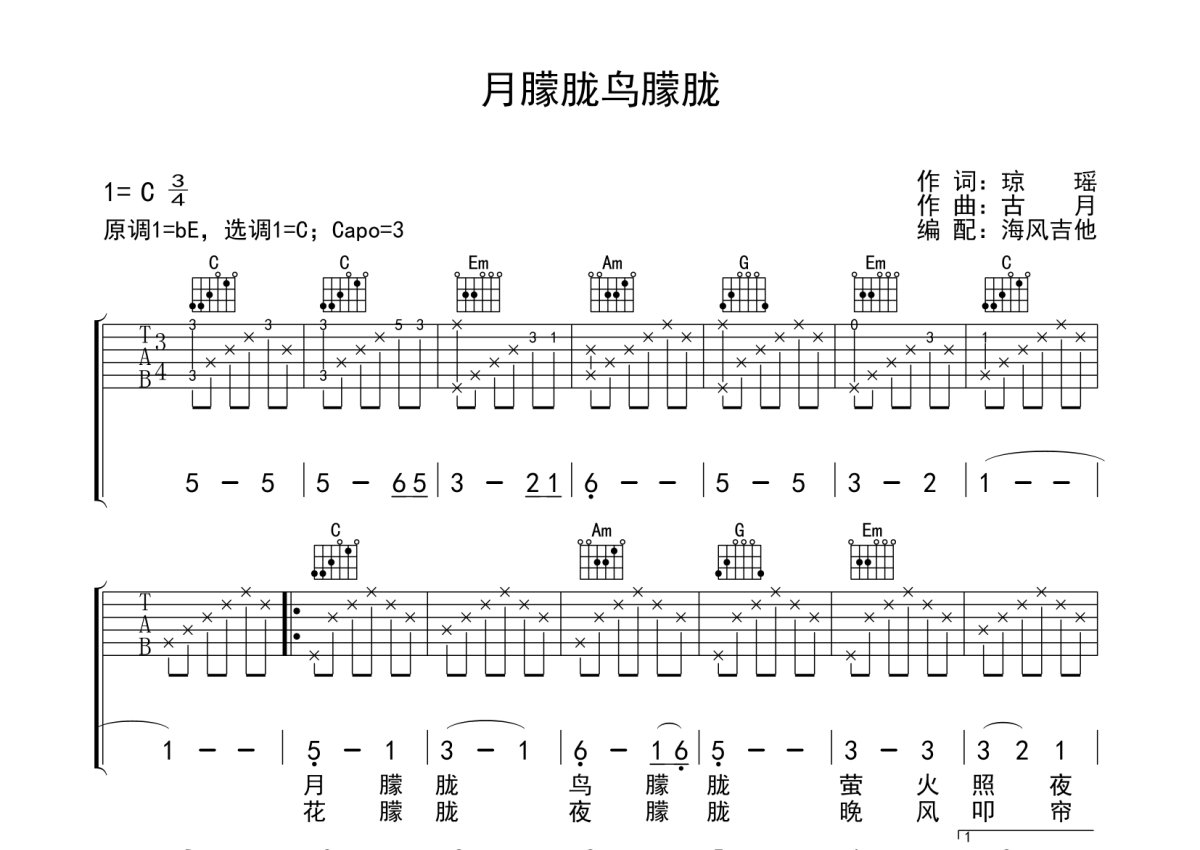 凤飞飞《月朦胧鸟朦胧》吉他谱 - C调弹唱六线谱