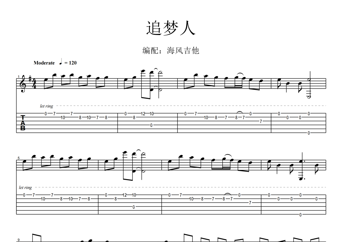 罗大佑/凤飞飞《追梦人》吉他谱 - 独奏六线谱