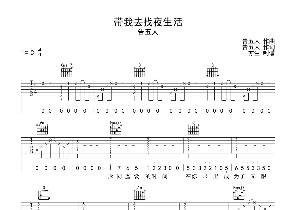 告五人《带我去找夜生活》吉他谱 - C调弹唱六线谱