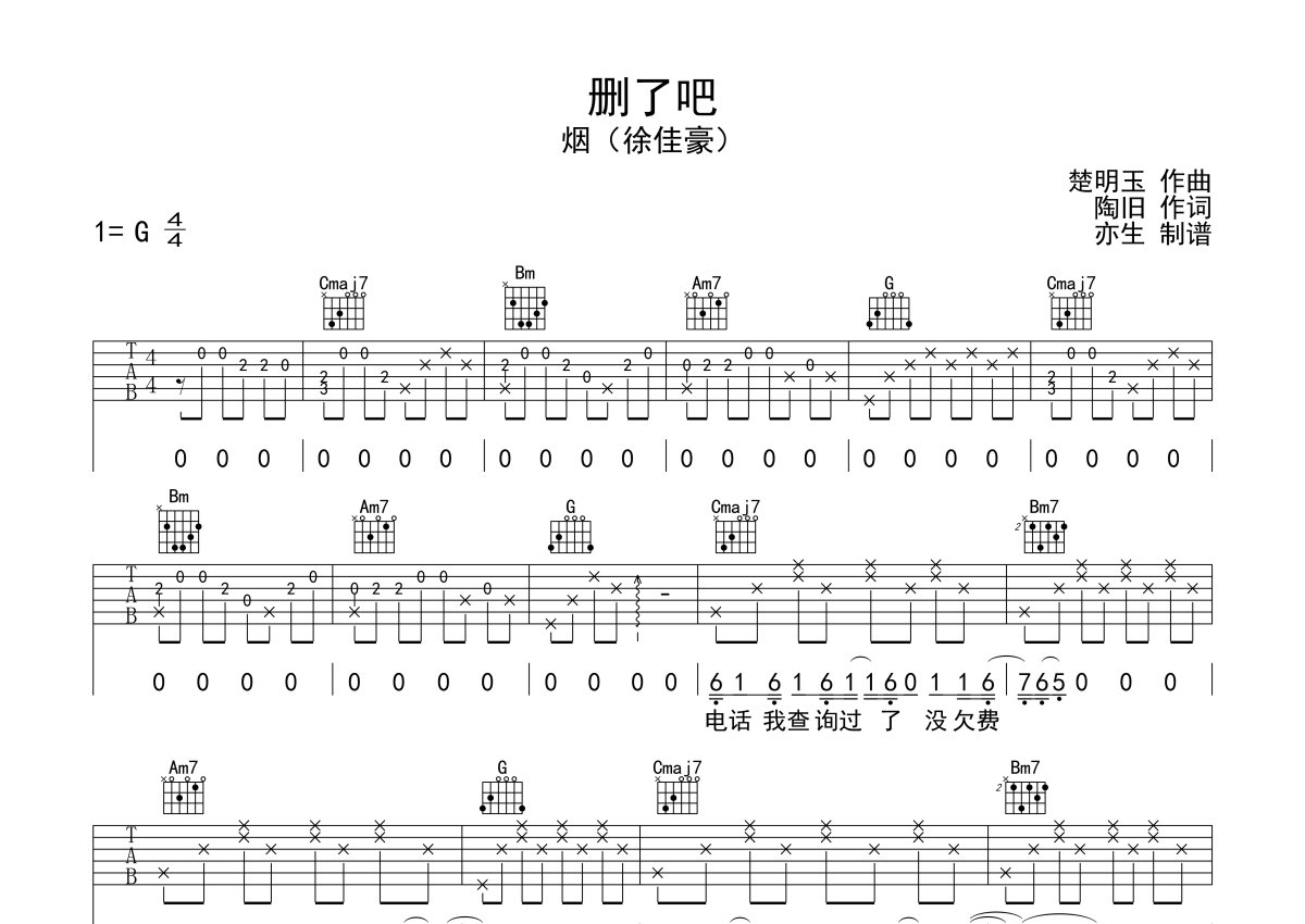 许佳豪《删了吧》吉他谱 - G调弹唱六线谱