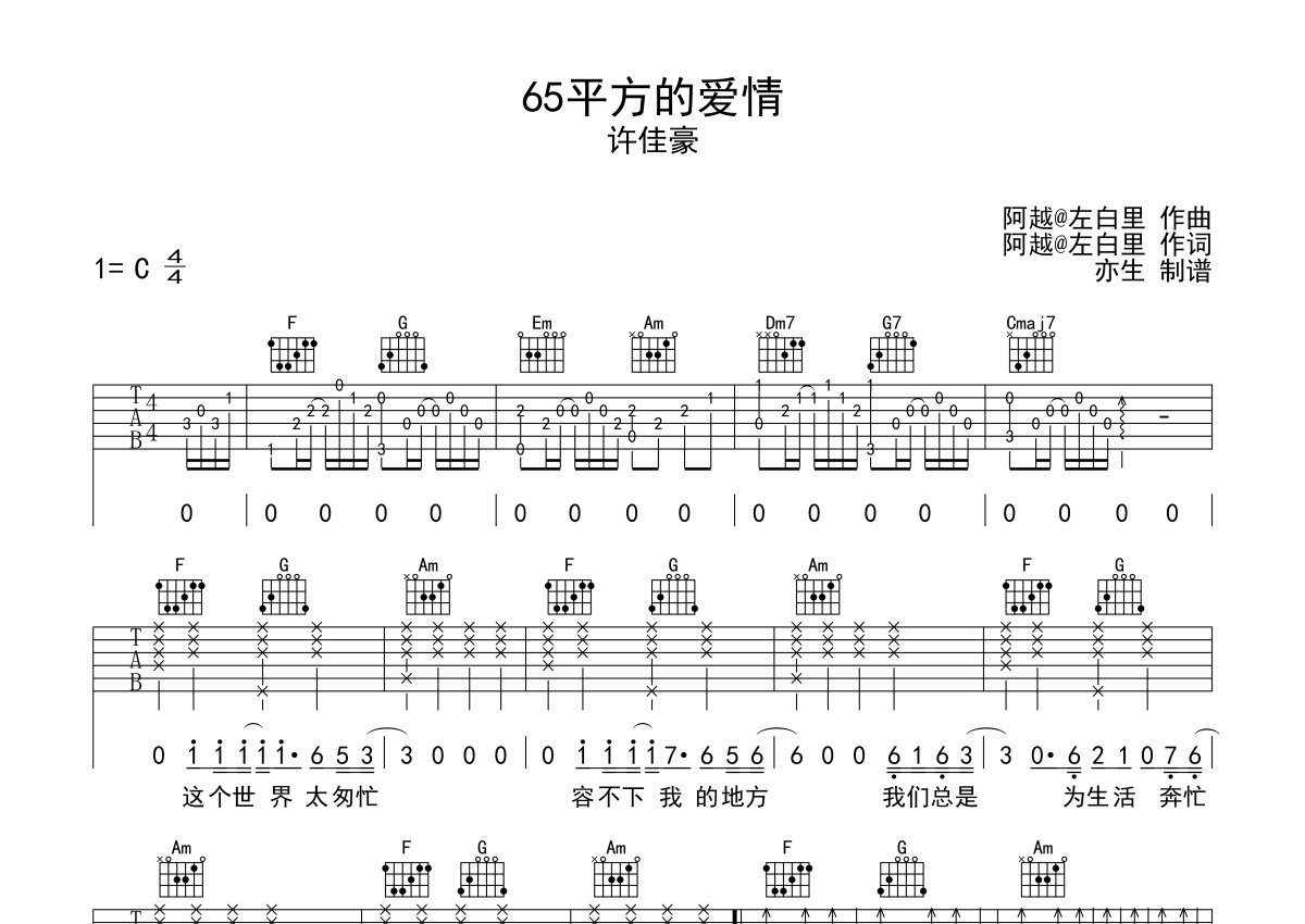 许佳豪《65平方的爱情》吉他谱 - C调弹唱六线谱