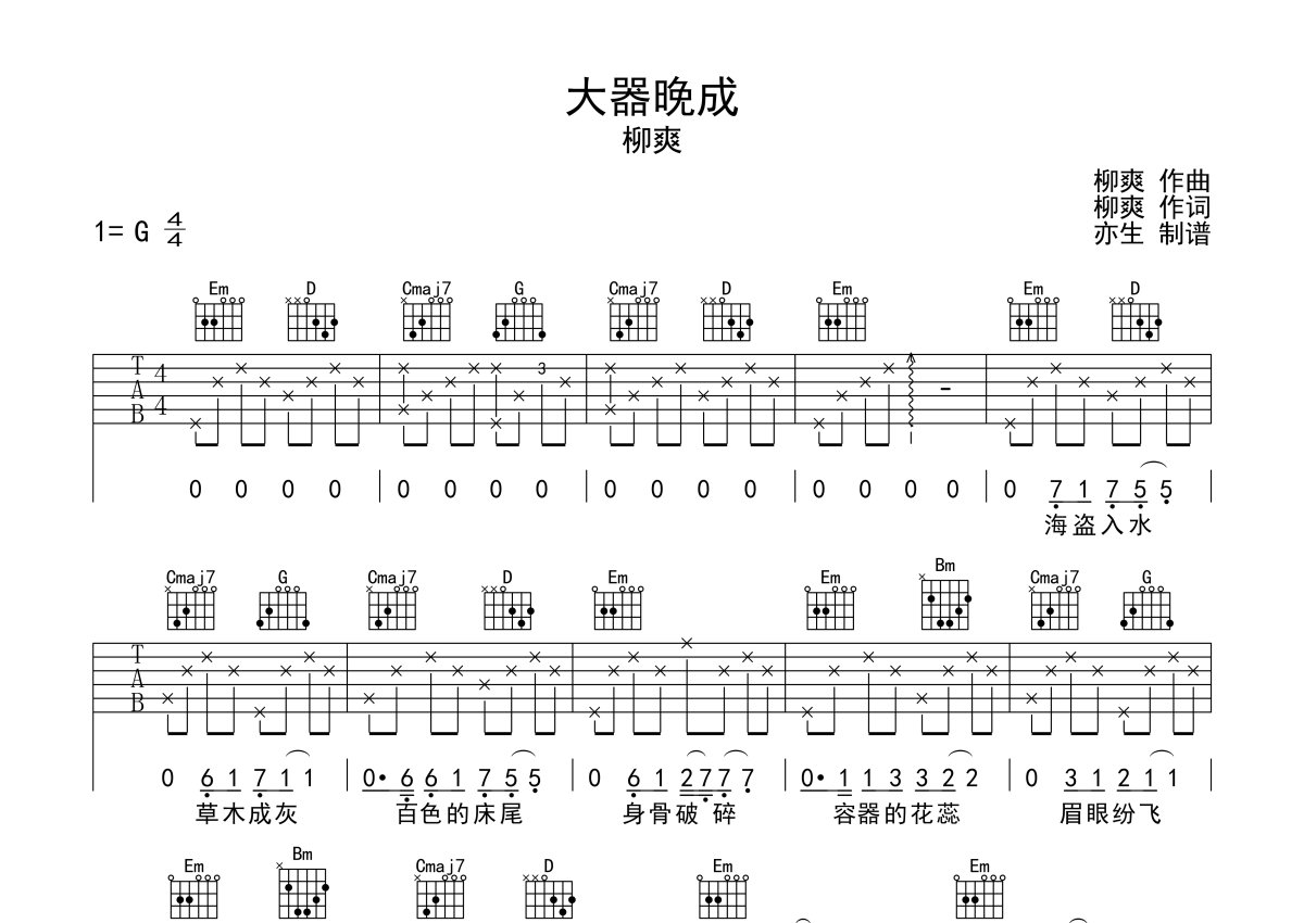刘爽《大器晚成》吉他谱 - G调弹唱六线谱