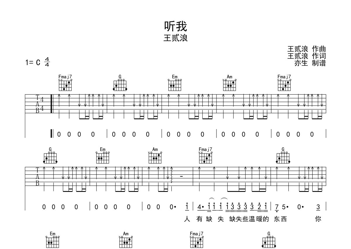王贰浪《听我》吉他谱 - C调弹唱六线谱
