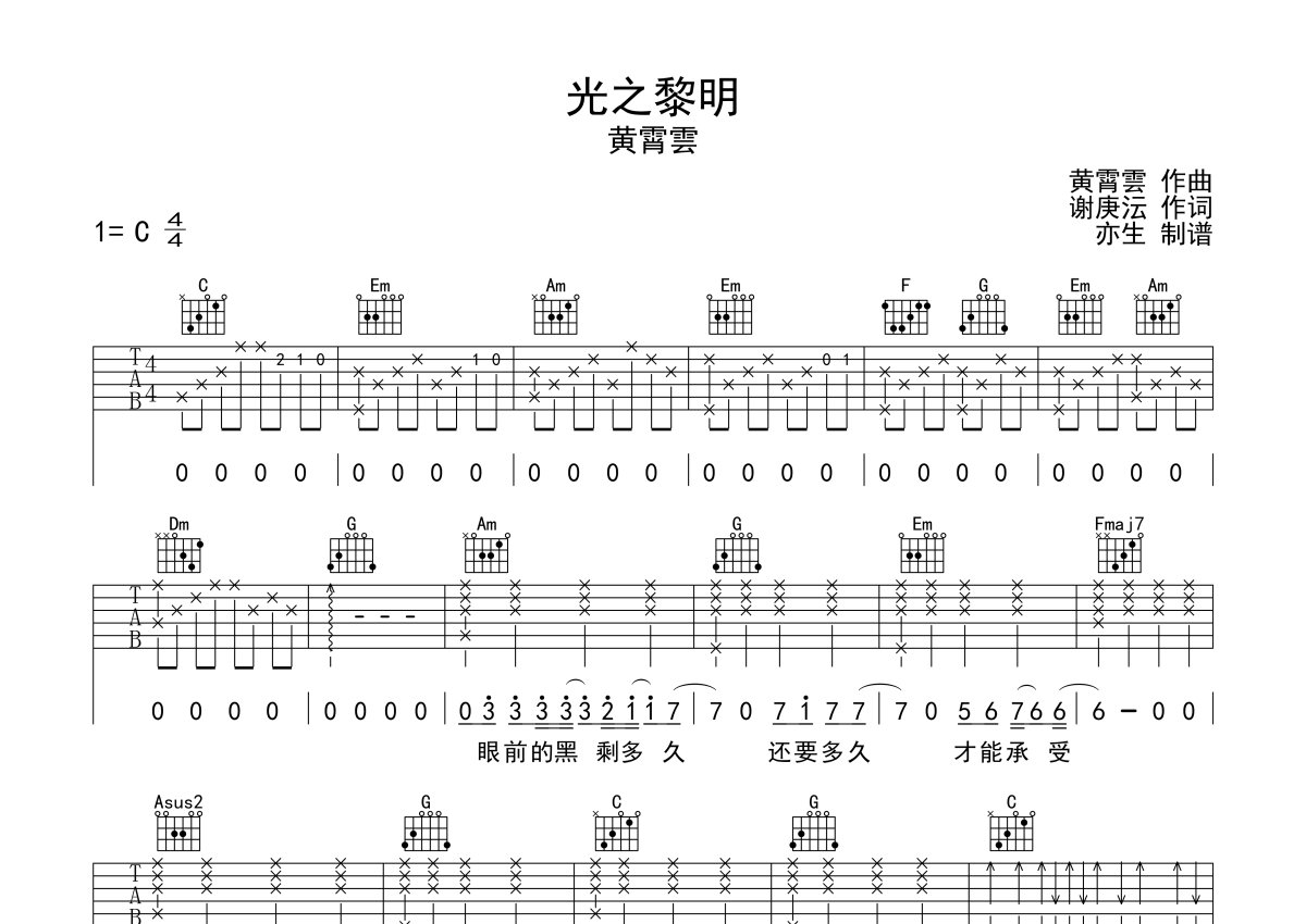 黄霄雲《光之黎明》吉他谱 - C调弹唱六线谱