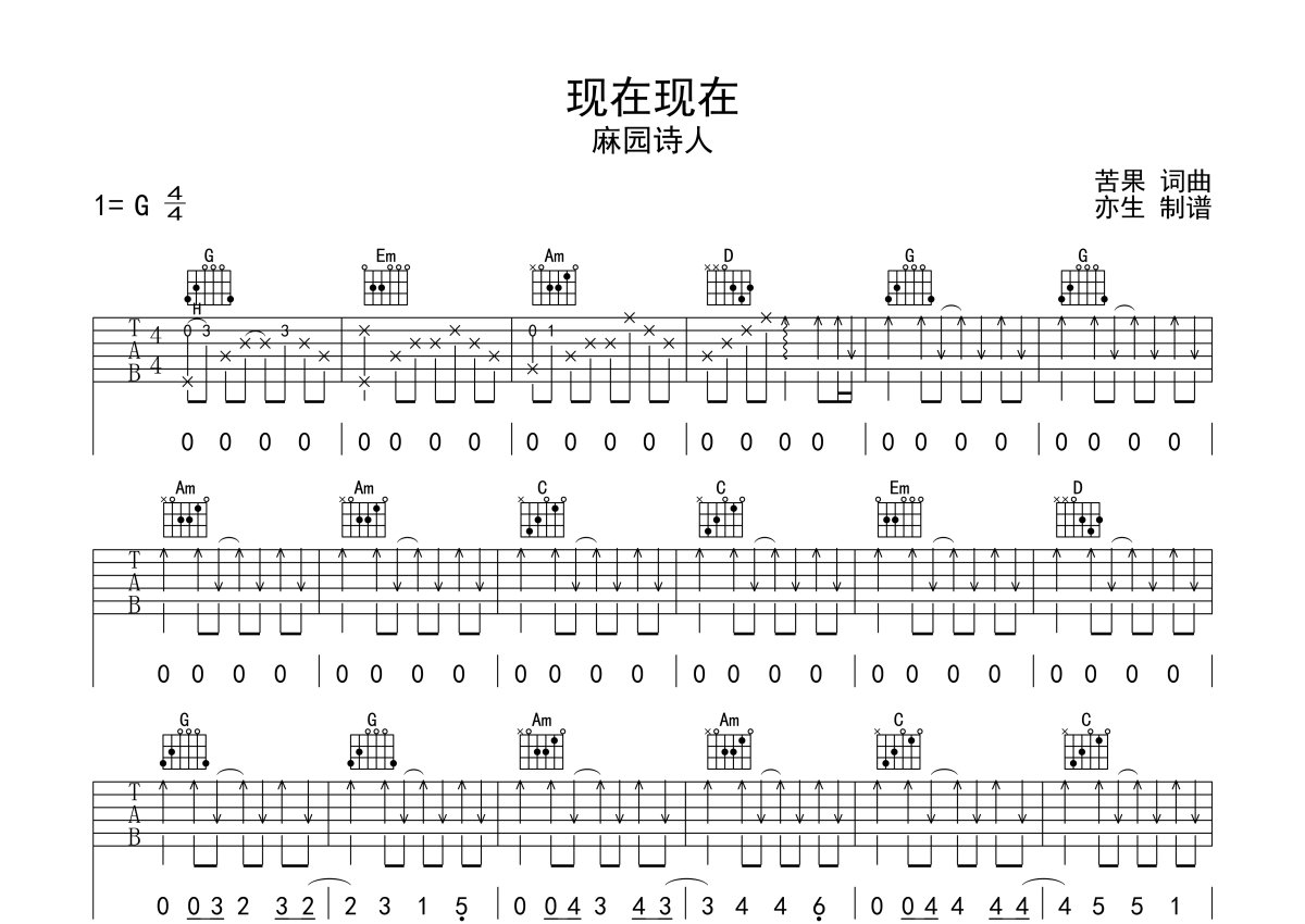 麻园诗人《现在现在》吉他谱 - G调弹唱六线谱