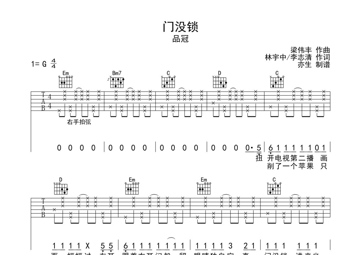品冠《门没锁》吉他谱 - G调弹唱六线谱