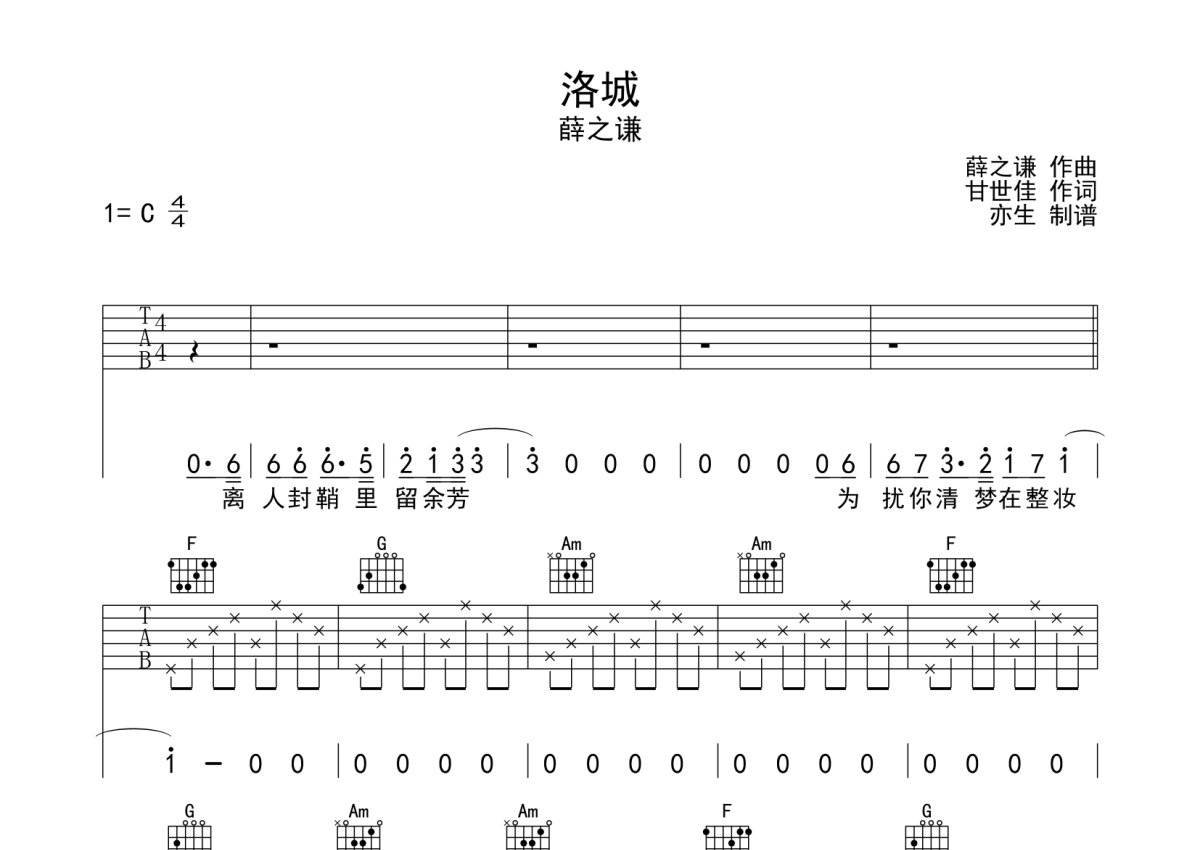 薛之谦《洛城》吉他谱 - C调弹唱六线谱