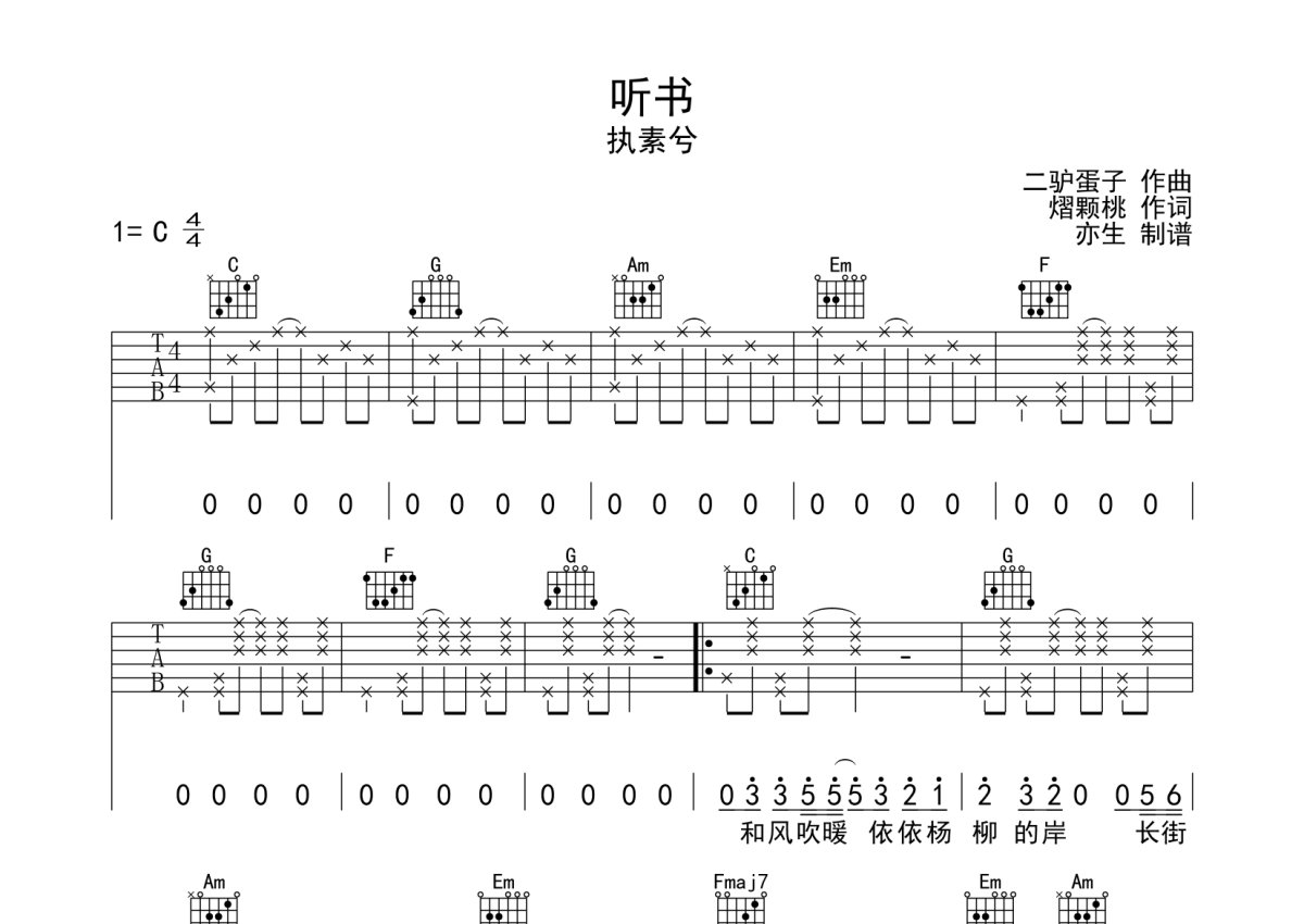 执素兮《听书》吉他谱 - C调弹唱六线谱
