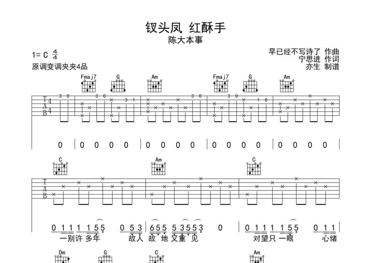 陈大本事《钗头凤 红酥手》吉他谱 - C调弹唱六线谱