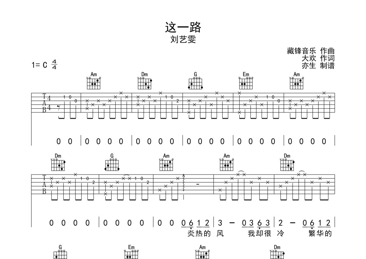 刘艺雯《这一路》吉他谱 - C调弹唱六线谱