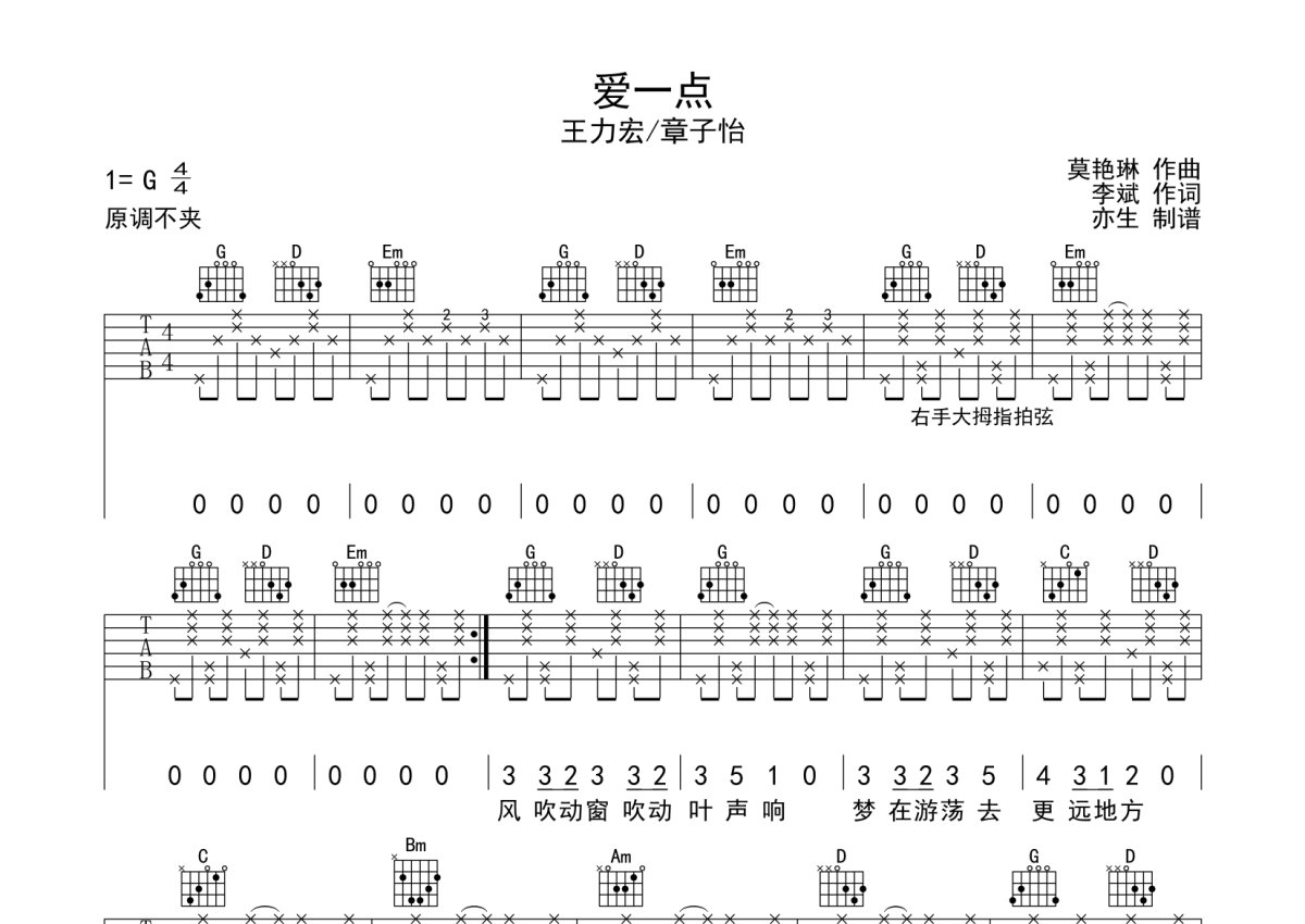 王力宏/章子怡《爱一点》吉他谱 - G调弹唱六线谱