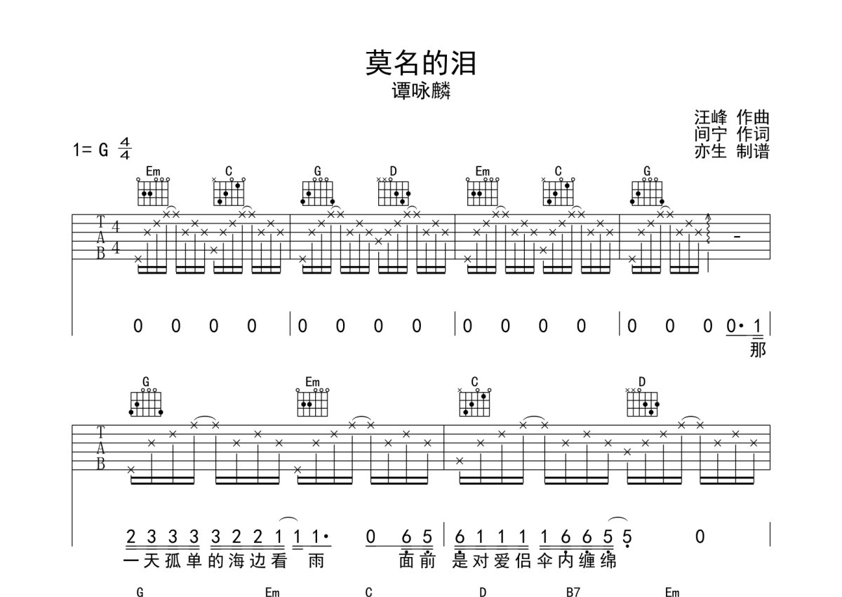 《莫名的泪》是谭咏麟演唱的一首歌曲,本吉他谱采用的是G调指法编配,这份吉他谱共有三张高清图谱,图谱由 @亦生 编配上传,图谱使用六线谱编配,包含吉他和弦指法、简谱以及歌词部分,使用这份莫名的泪吉他谱,可以让你更加方便地掌握这首歌曲的弹唱技巧,快来尝试吧。本谱采用G调和弦指法编配,节奏为4/4拍,速度为95拍每分钟,弹唱建议变调不夹,难度较简单。
