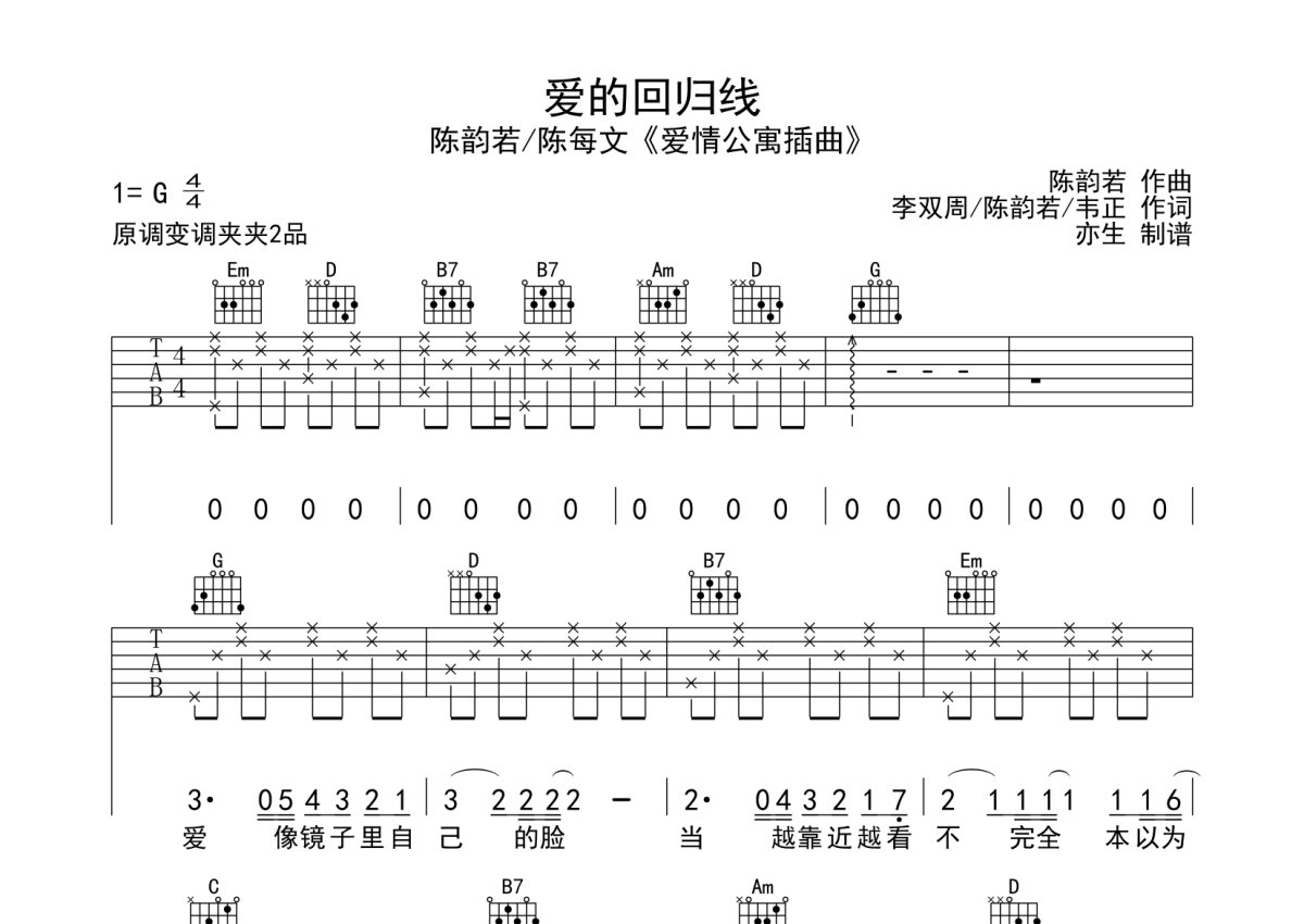 陈韵若/陈每文《爱的回归线》吉他谱 - G调弹唱六线谱