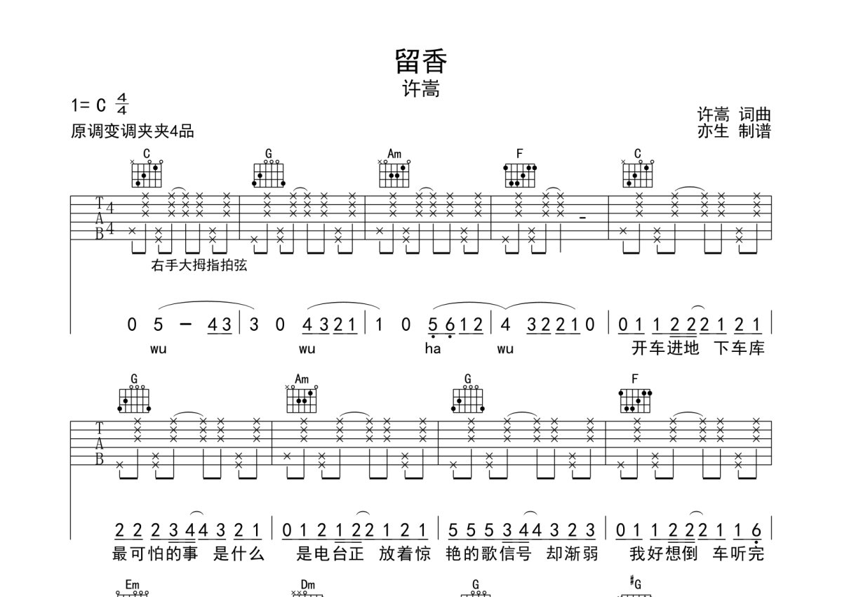 许嵩《留香》吉他谱 - C调弹唱六线谱