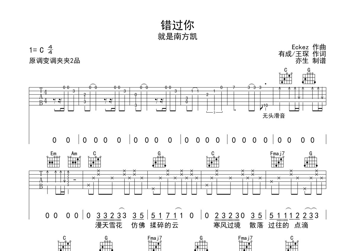 就是南方凯《错过你》吉他谱 - C调弹唱六线谱